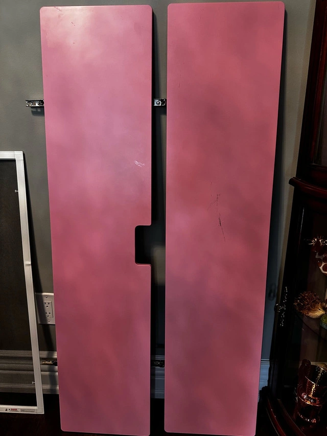These are two, pink colored, used cabinet doors in fair condition. They measure 15 inches in width and are 48 inches tall. Perfect for a DIY project or replacement.