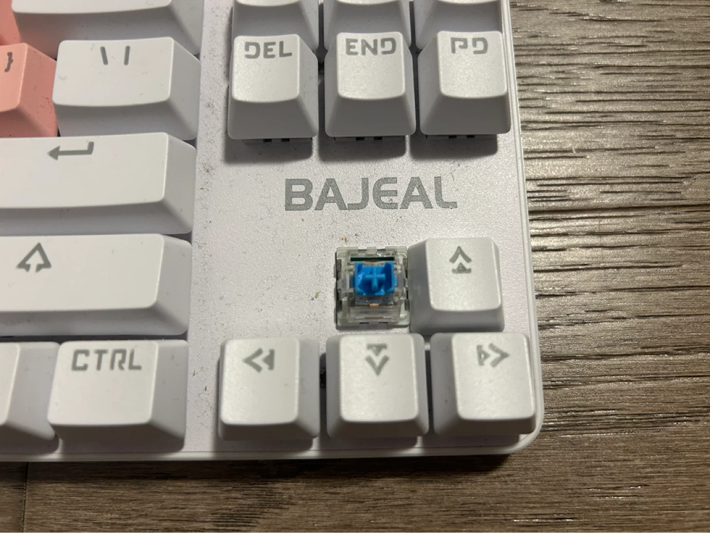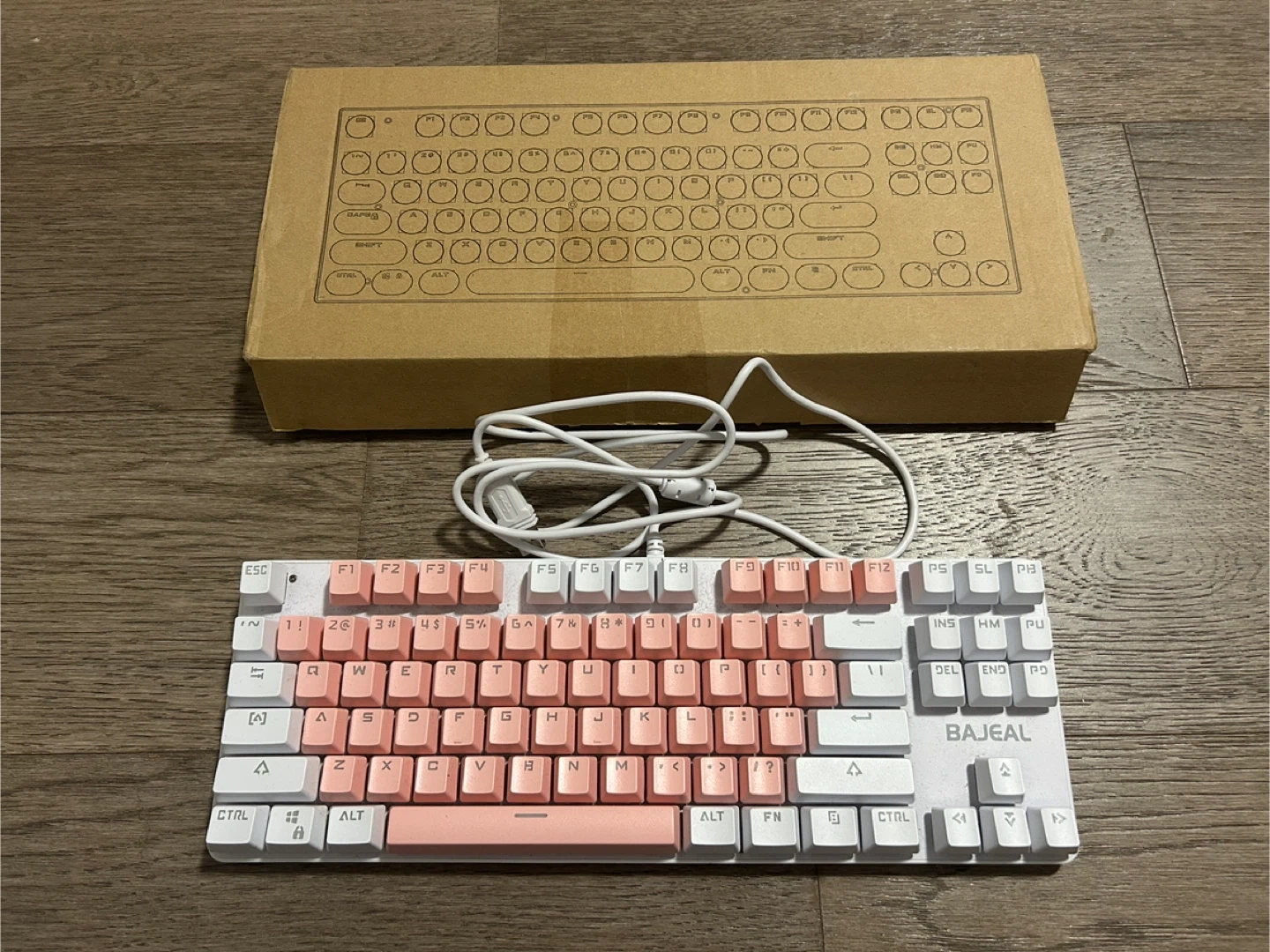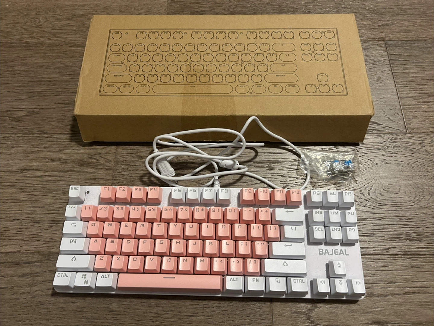 Selling a blue switch mechanical keyboard in a cute pink and white colour scheme! It comes with the original box and some extra key switches. Perfect for gaming or adding a pop of colour to your workspace.