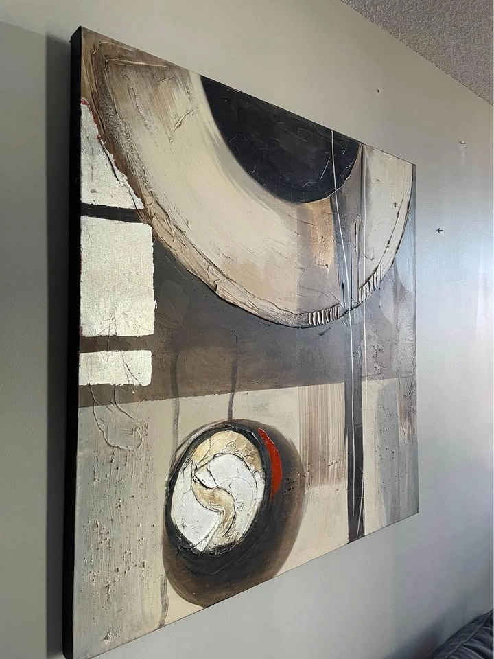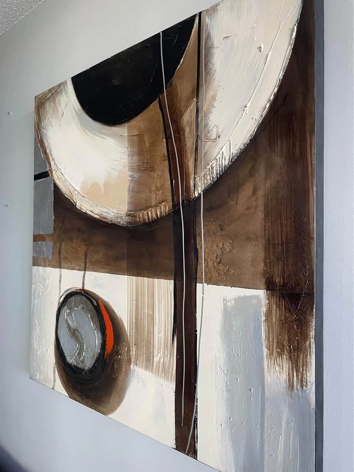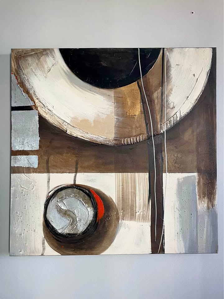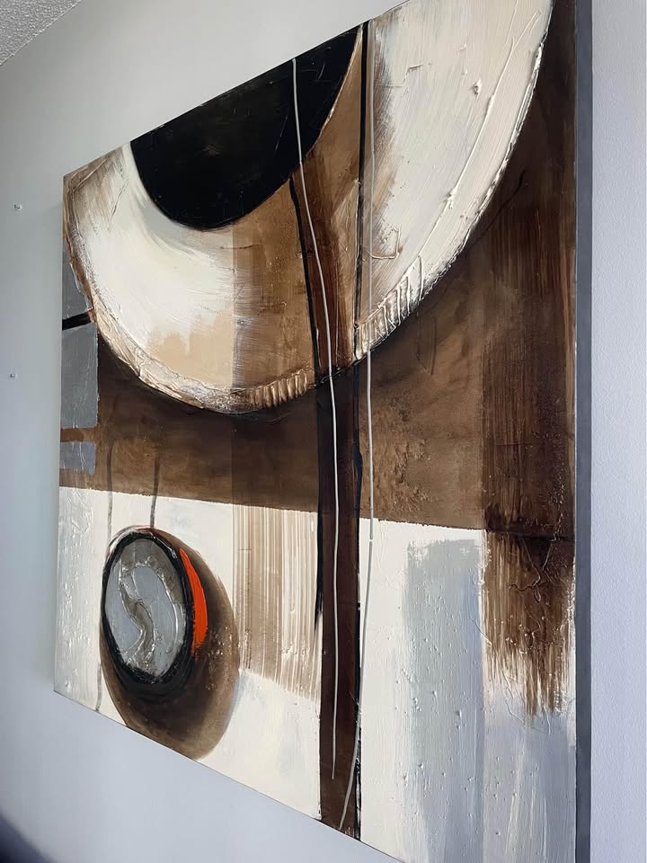 High quality abstract painting with browns, beiges, black and red colours on a 1.5” thick canvas.