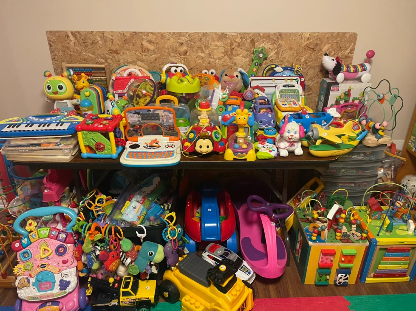 Leap Frog, Bead Maze in various sizes from small to extra large, Trucks, VTECH educational and musical toys, Manhattan infant toys, Mega Blocks in various sizes, Little People toys, Musical Instruments, Fisher Price toys, Lamaze, Little Tikes, Hot Wheels, Building blocks, wood puzzles, wood toys, Lego Duplo, Lego Classic, Crib and stroller hanging toys, pop up toys, sorter toys, plus many, many various baby toys, etc.