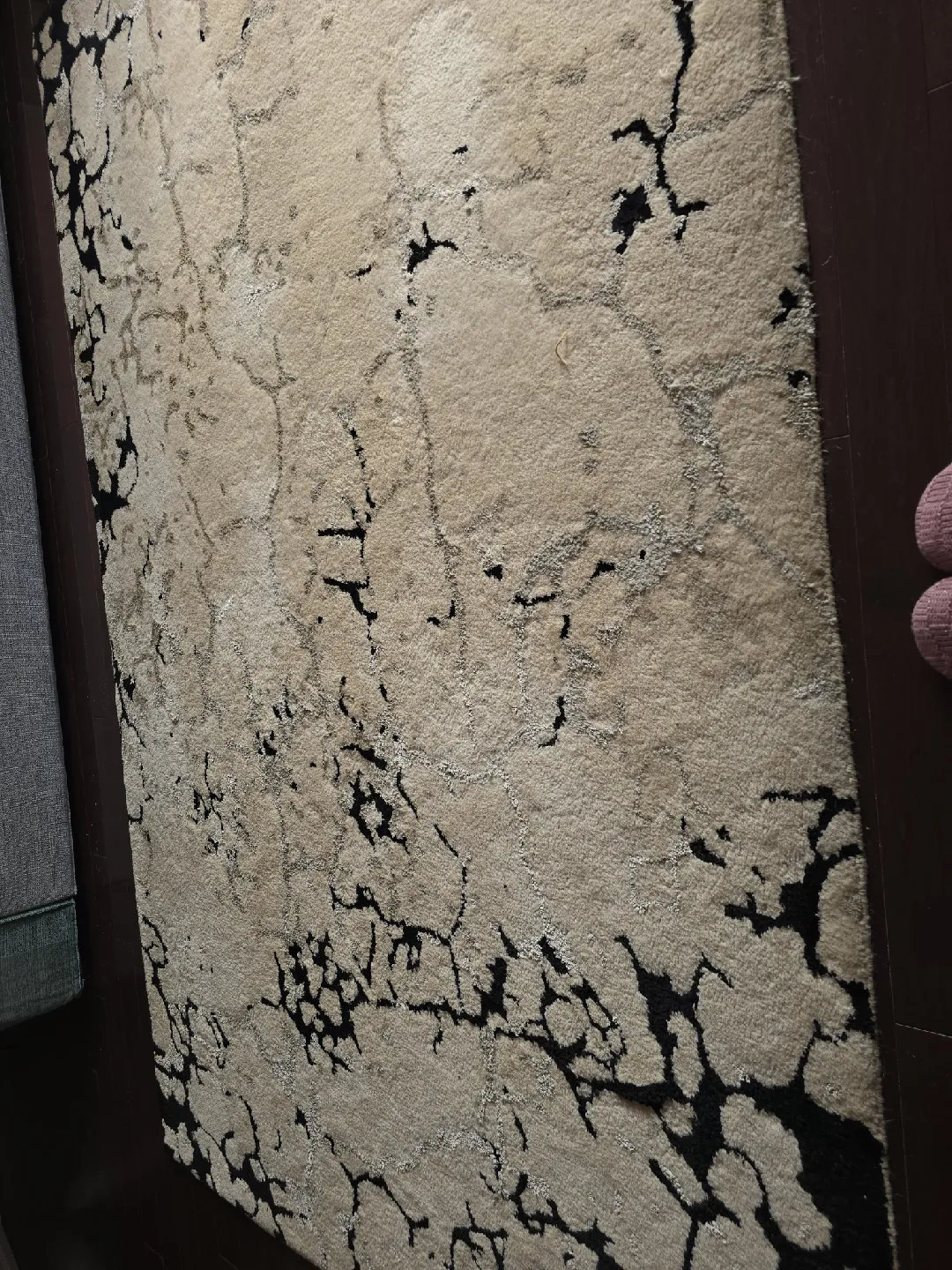 Here's a stylish area rug with a unique pattern! It's in great shape and would look lovely in any living space. The neutral colours make it easy to match with existing decor
