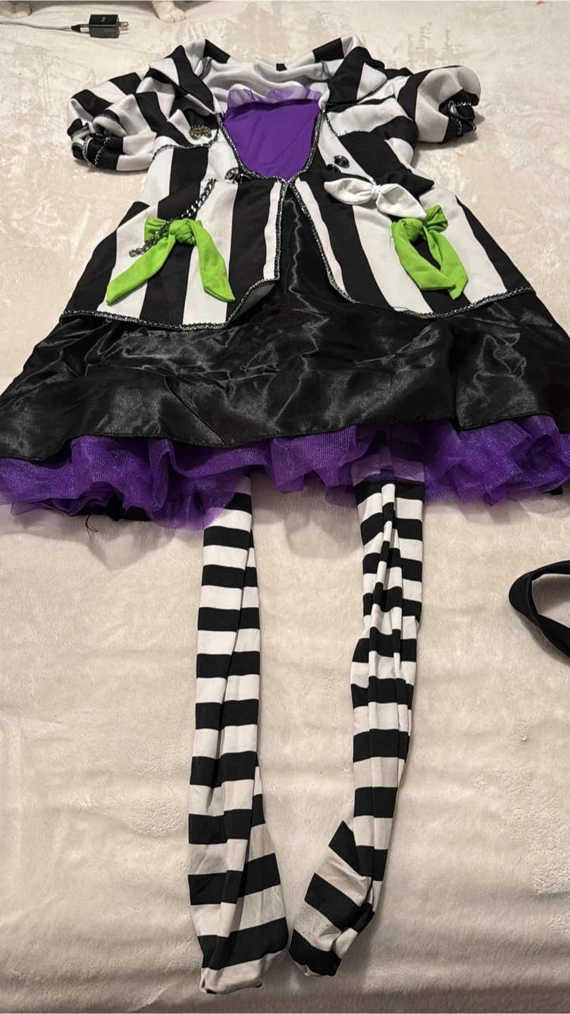 Get ready for Halloween with this Beetlejuice inspired costume! It features a black and white striped dress with a purple accent and striped leggings. Perfect for a fun and spooky look!