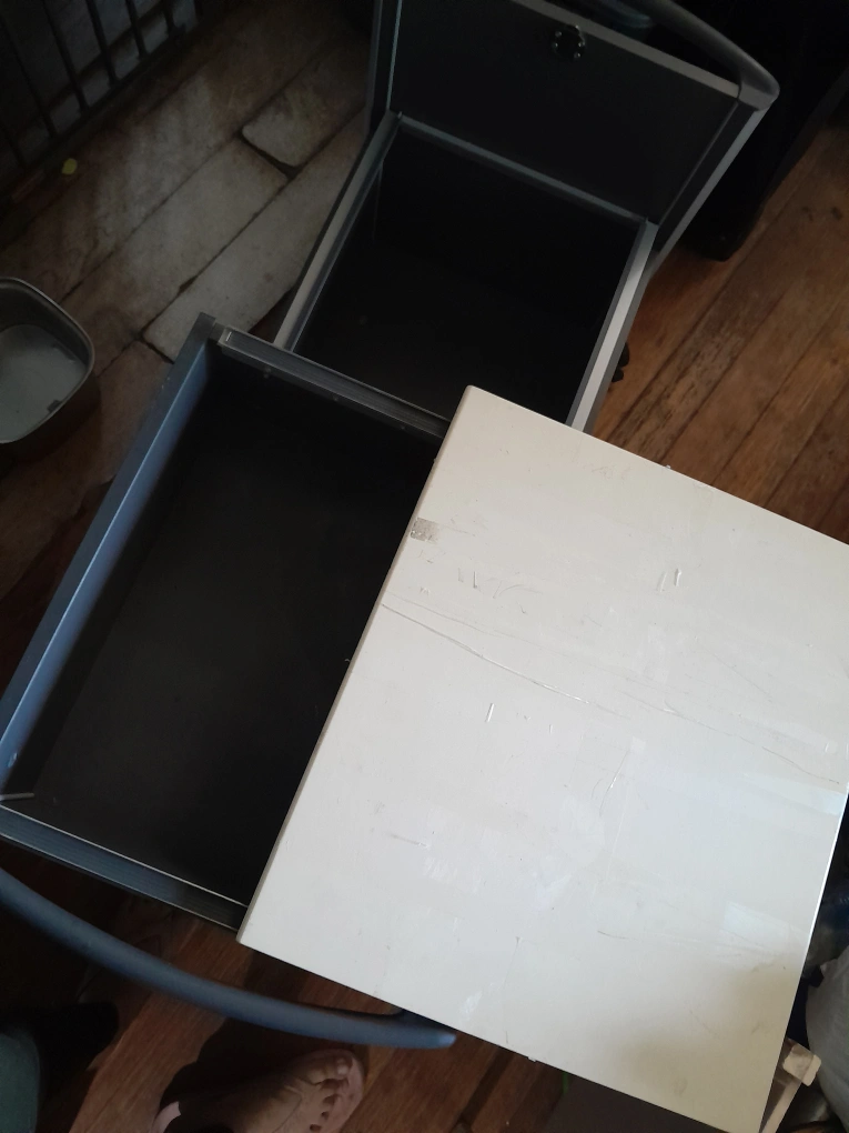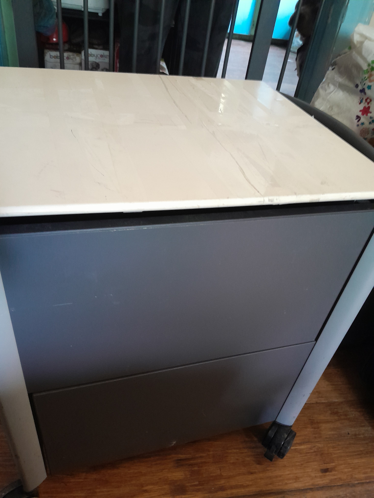 Selling a rolling file cabinet with two drawers. It's in good condition and perfect for organizing your documents and files. The cabinet is on wheels, making it easy to move around your home or office. Great for adding extra storage!