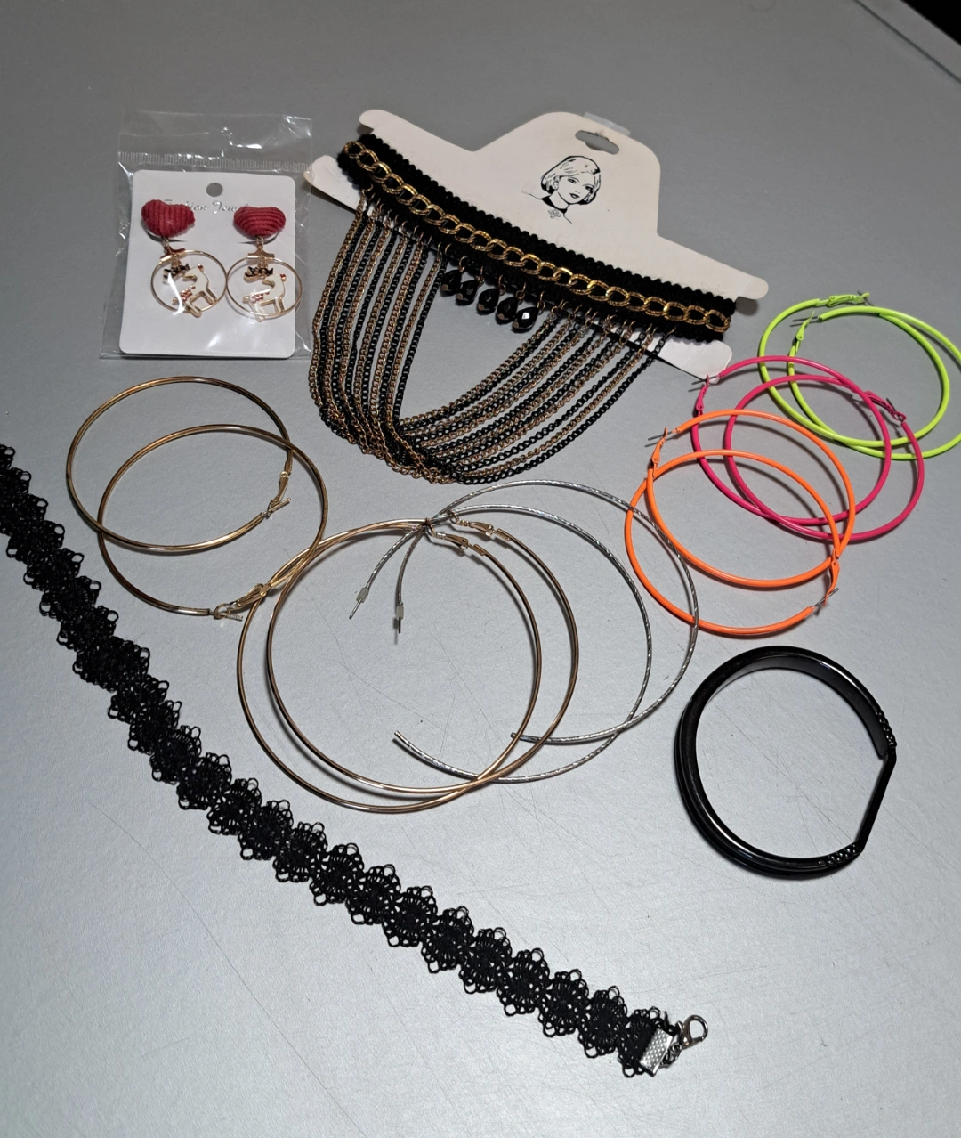 423Selling a collection of various jewellery pieces! This lot includes a mix of earrings, chokers, and hoop earrings in different styles and colours. Perfect for adding some variety to your accessories. Each - $2 Everything - $6