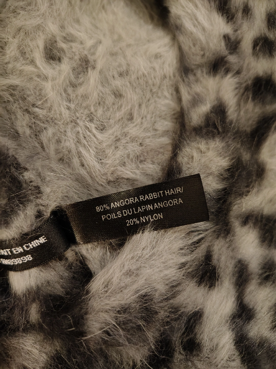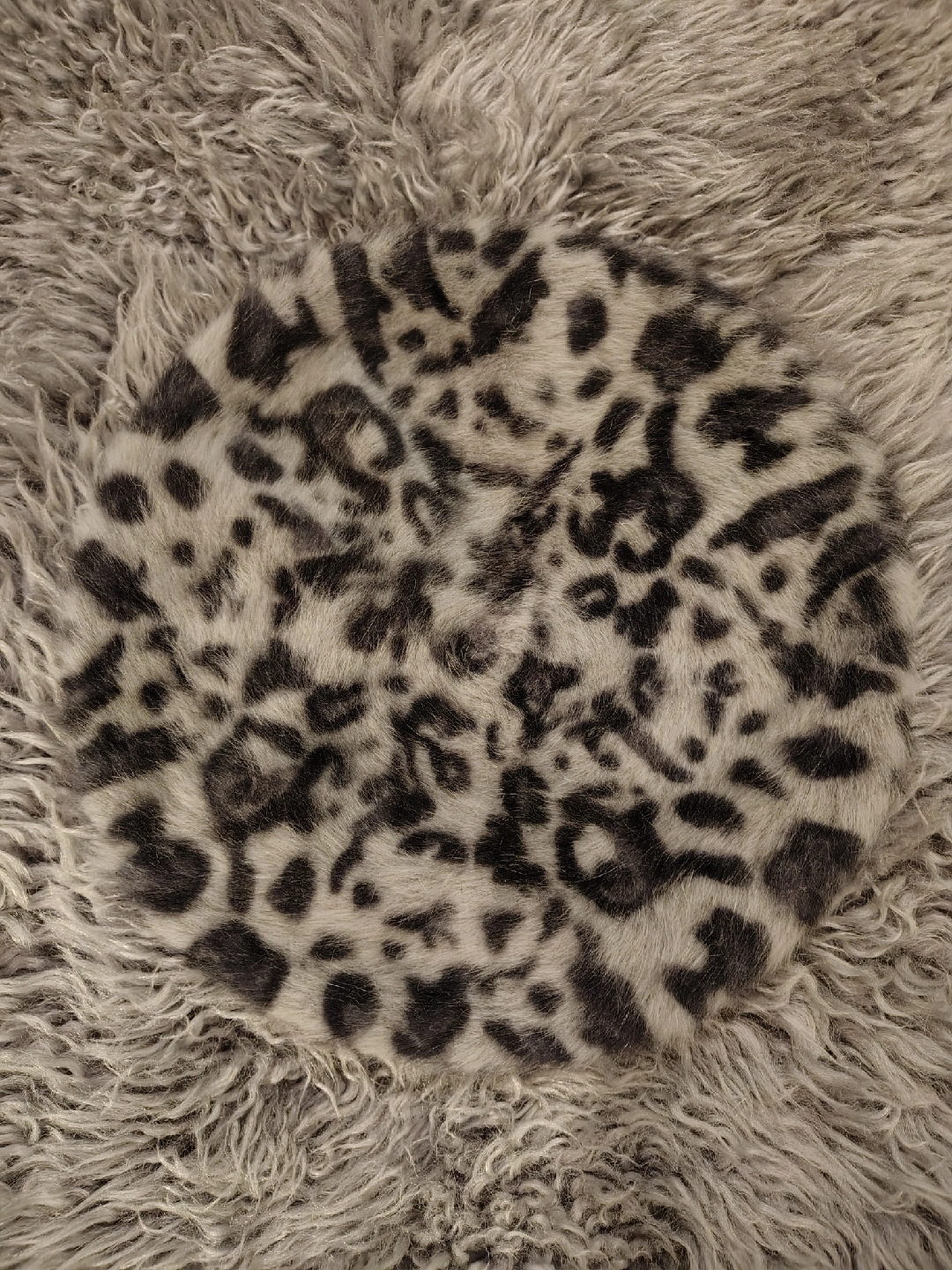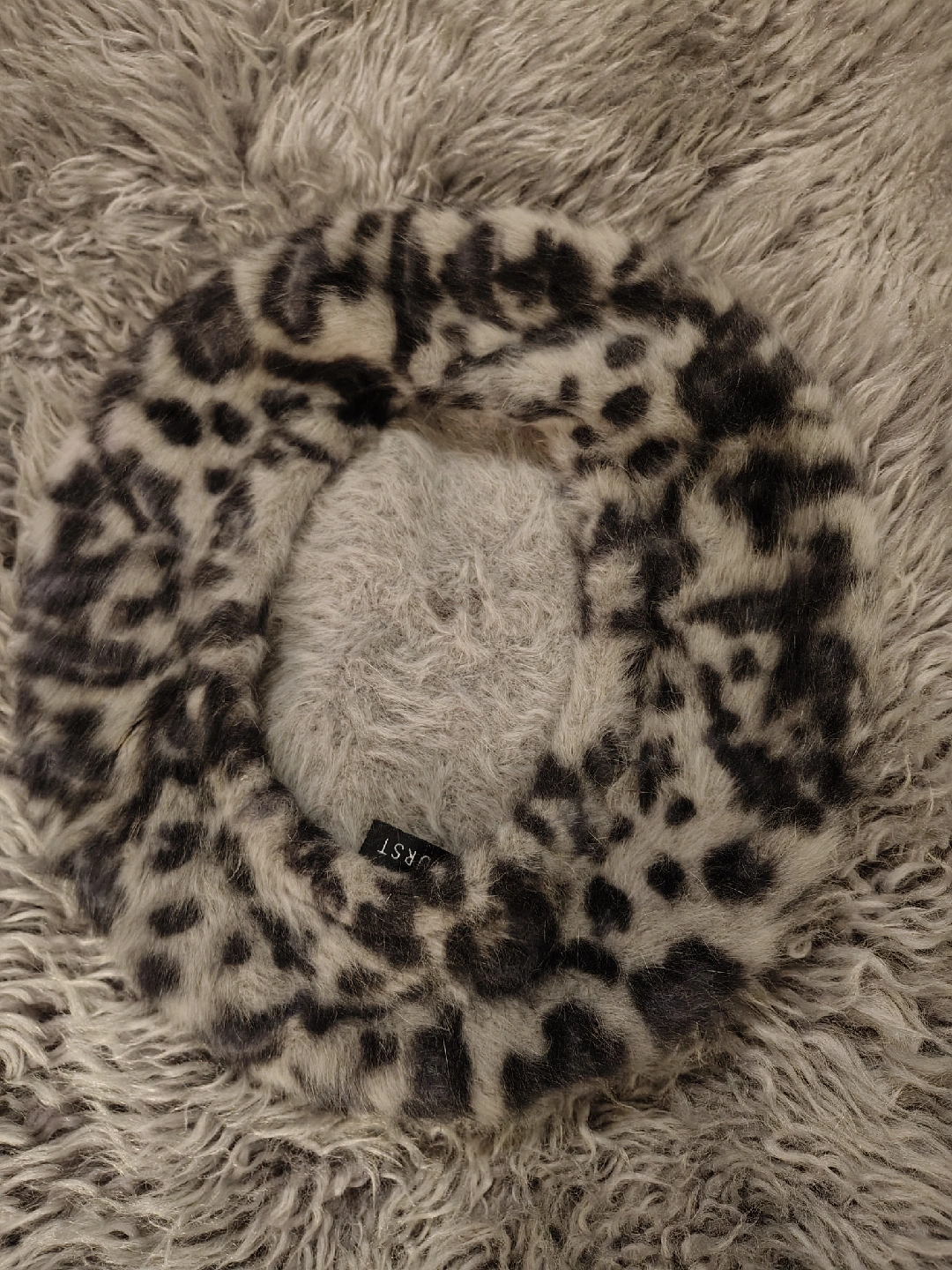 Selling a stylish Parkhurst beret! It's made of 80% angora rabbit hair and 20% nylon, giving it a soft and luxurious feel. The beret features a unique leopard print pattern in shades of grey and black. Perfect for adding a touch of elegance to any outfit! the fur is soft and keeps warm, used once.