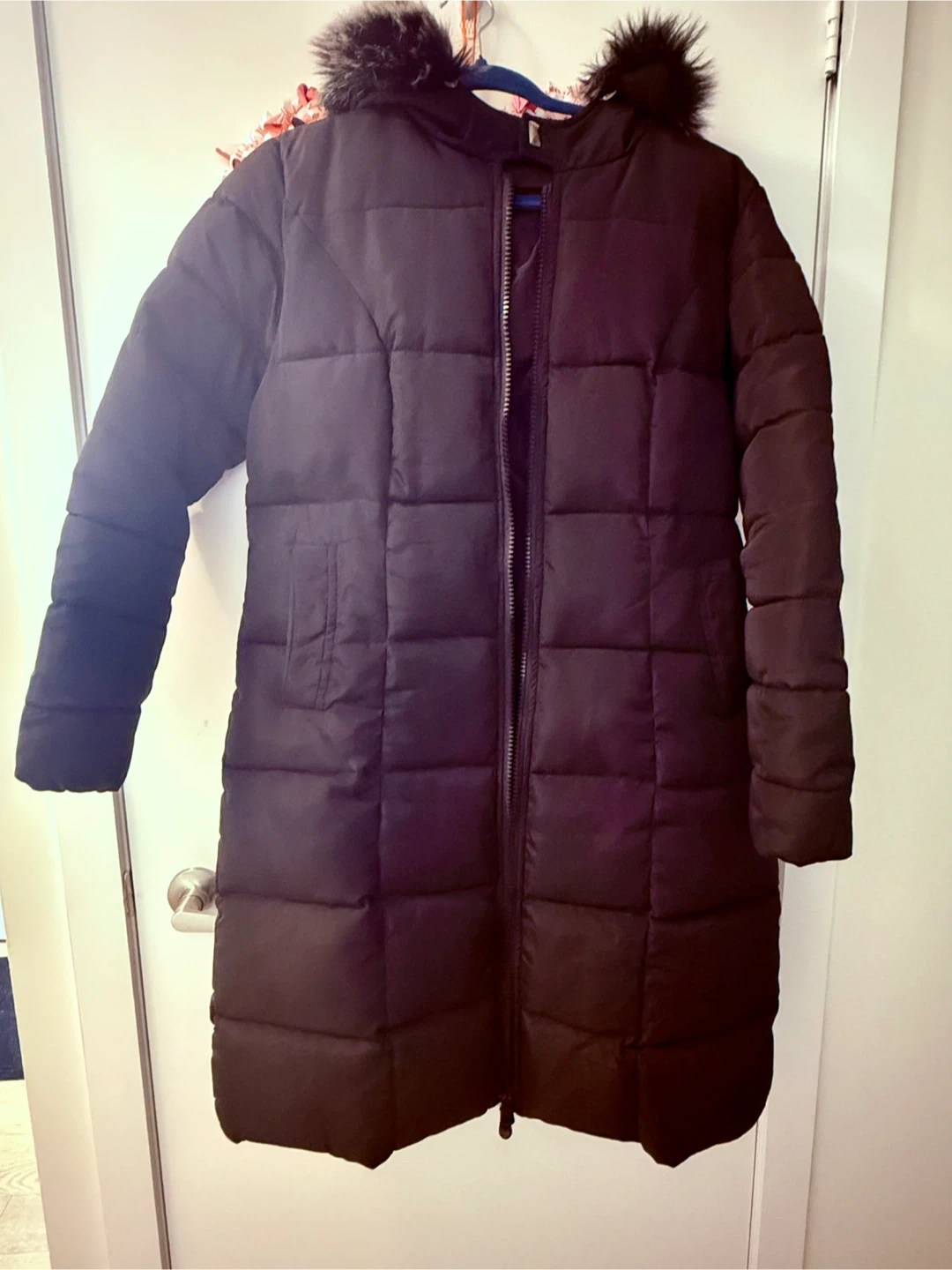Selling a cozy black puffer coat! It's in great condition and perfect for the Canadian winter. The coat features a faux fur hood for extra warmth and style. It's a stylish and practical choice for staying warm during the colder months.