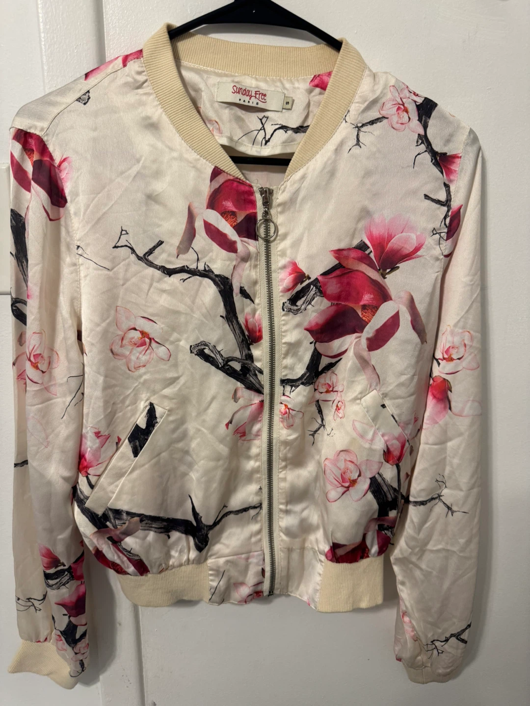 Here's a beautiful silk floral bomber jacket from Sunday Free! It's a size medium and features a lovely floral pattern on a cream-coloured background. Perfect for spring or fall!