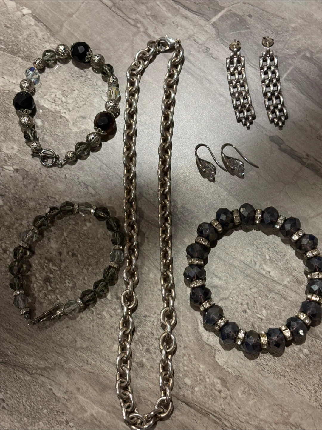 Selling a collection of costume jewellery, including a chain necklace, beaded bracelets, and earrings. These pieces are perfect for adding a touch of sparkle to any outfit!