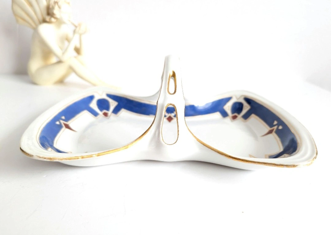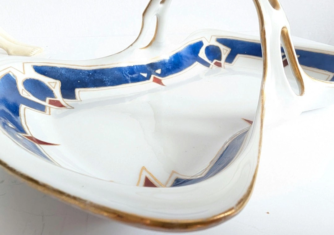 Rare Limoges porcelain basket dish. Hand painted in an Art Deco design around outer rim. Measures approximately 10 inches (25.5 cm) x 7 inches (17.5 cm). Good vintage condition, consistent with age. Very slight wear to gold trim on the handle. No chips or cracks. Excellent Art Deco period charm.