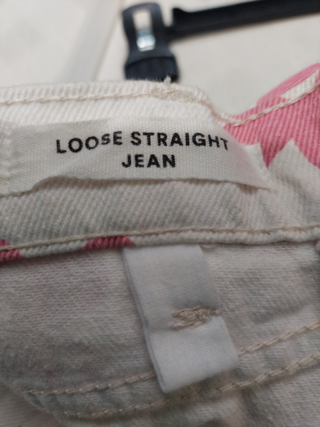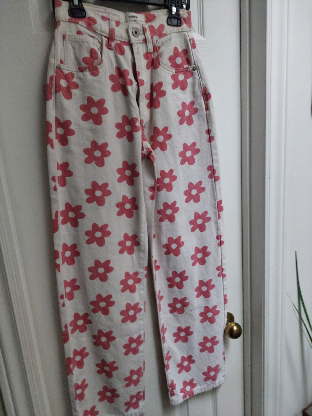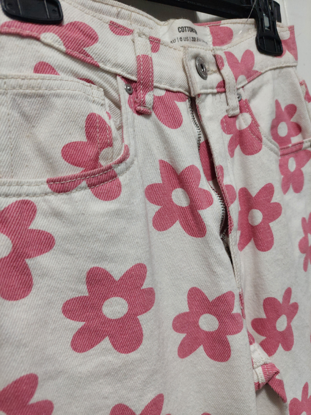 These Cotton On loose straight jeans are super cute with a pink flower pattern on a off-white background. They're a women's size 4. Perfect for adding a pop of colour to your wardrobe!