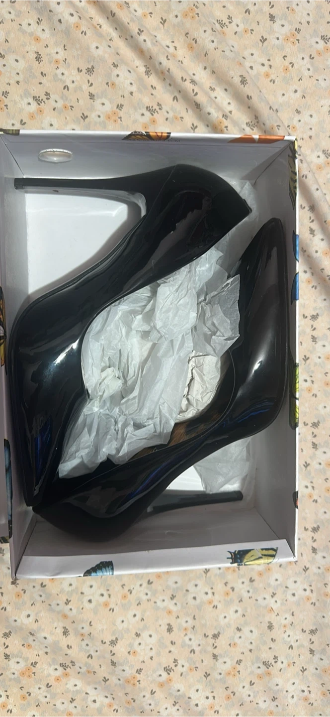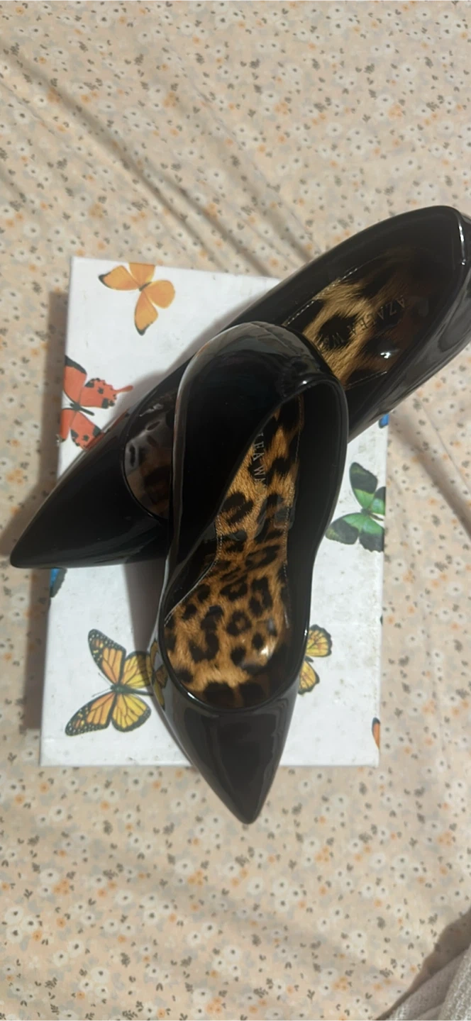 Selling a pair of Azalea Wang black patent leather heels in size 6. They come with the original box. The inside of the shoe has a leopard print pattern.