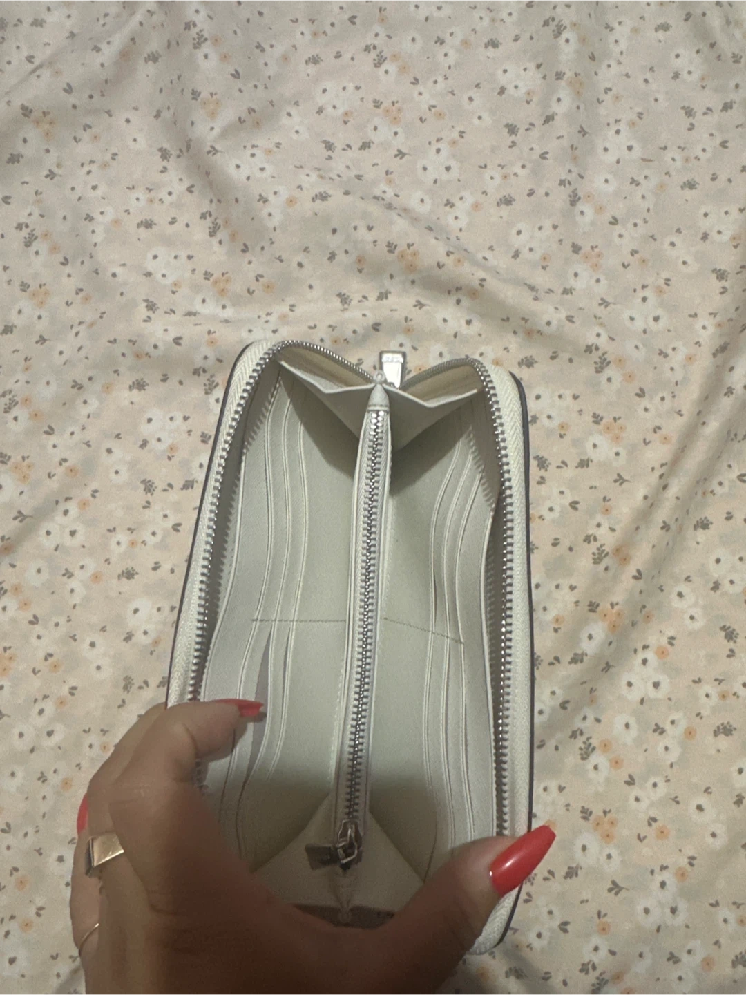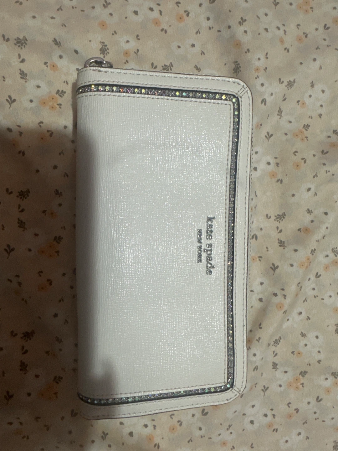 Selling a Kate Spade wallet in white. It features a zip-around closure and has a stylish design with a sparkly trim. It's perfect for keeping your cards and cash organized!