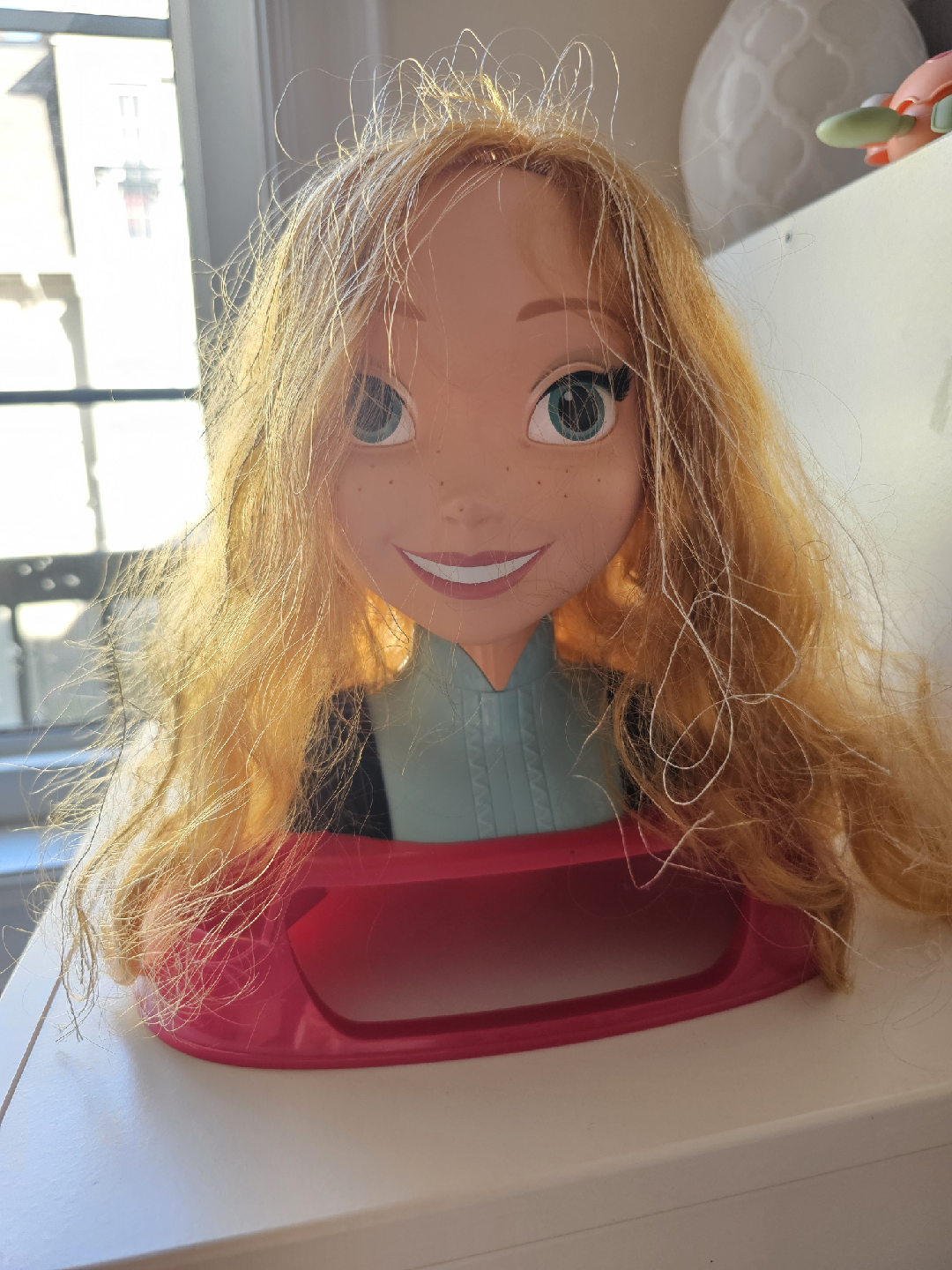 Selling a Frozen Anna doll head with long, tangled hair. It would be perfect for practicing hairstyles or for arts and crafts. As you can see, the hair is quite messy, but it's still got potential!