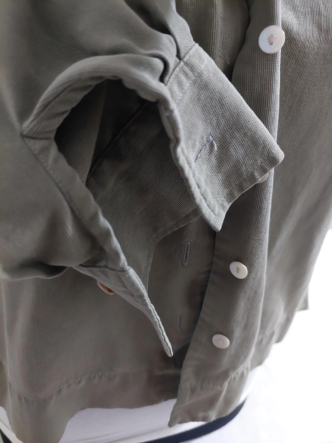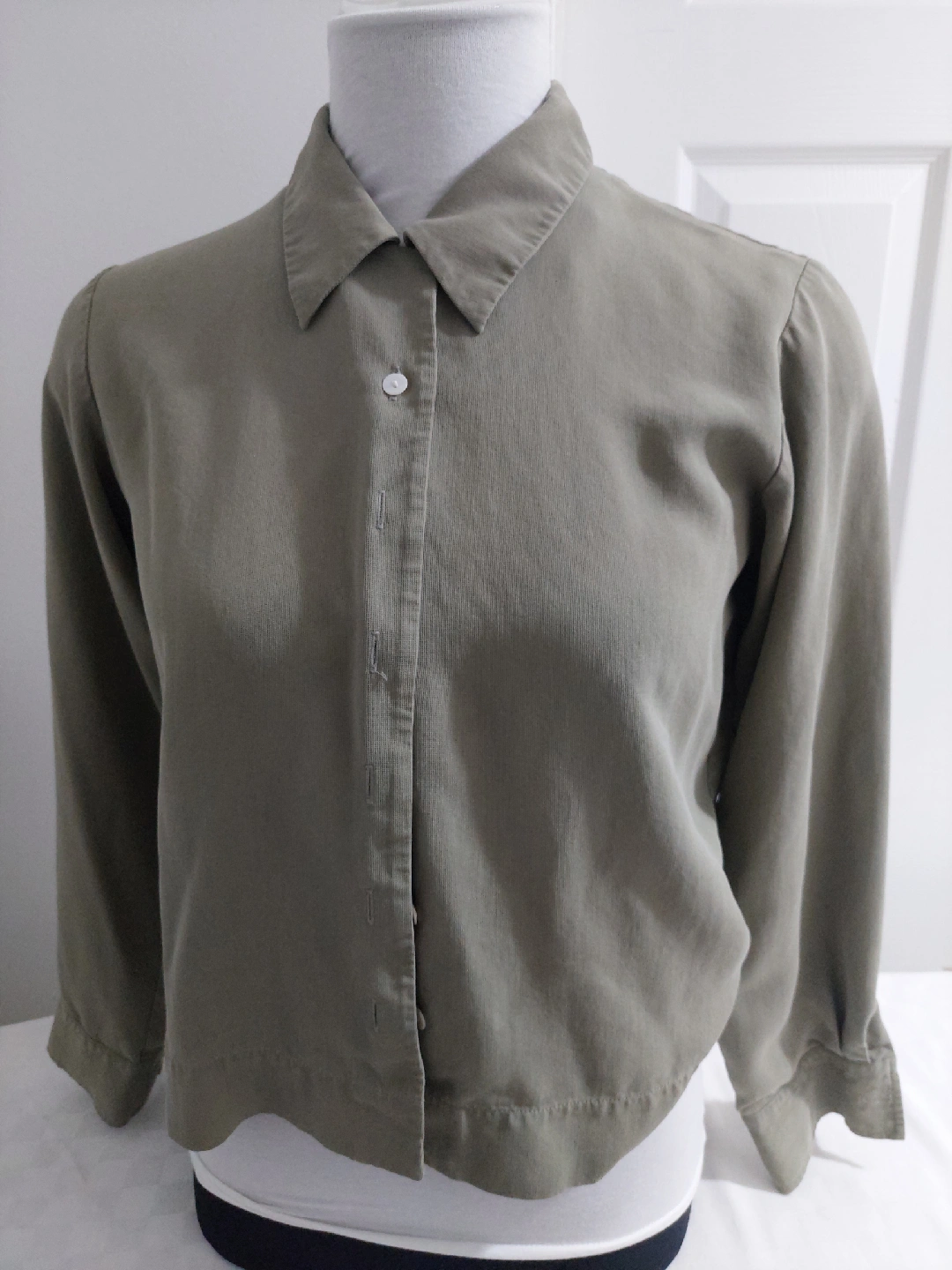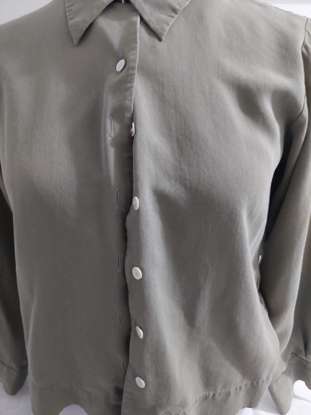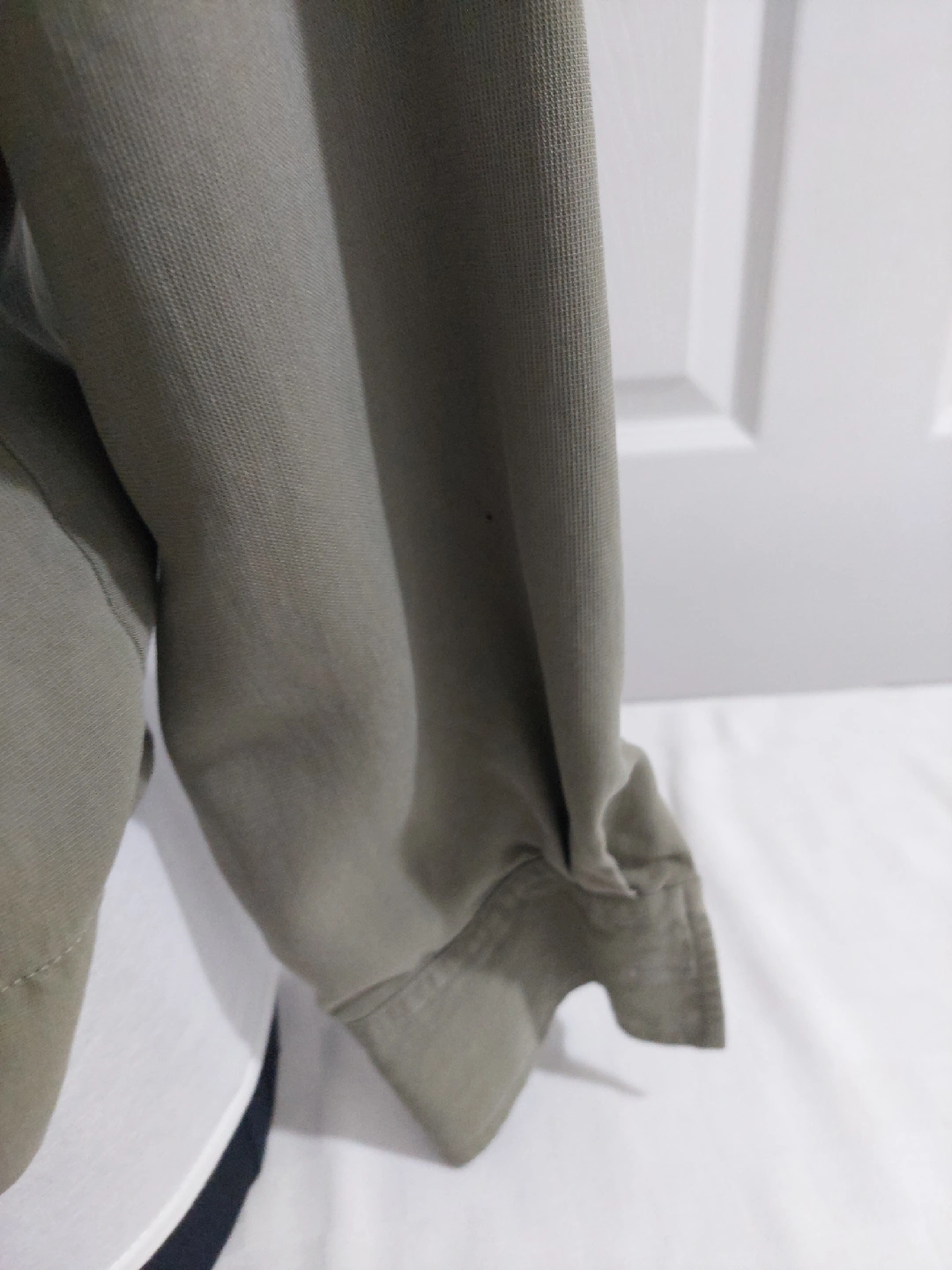 Here's a gently used olive green long-sleeve button-up shirt! The material feels soft and comfortable, perfect for layering or wearing on its own. It features a classic collar and buttoned cuffs. Please take a look at my other items. Discount applies on multiple purchases.