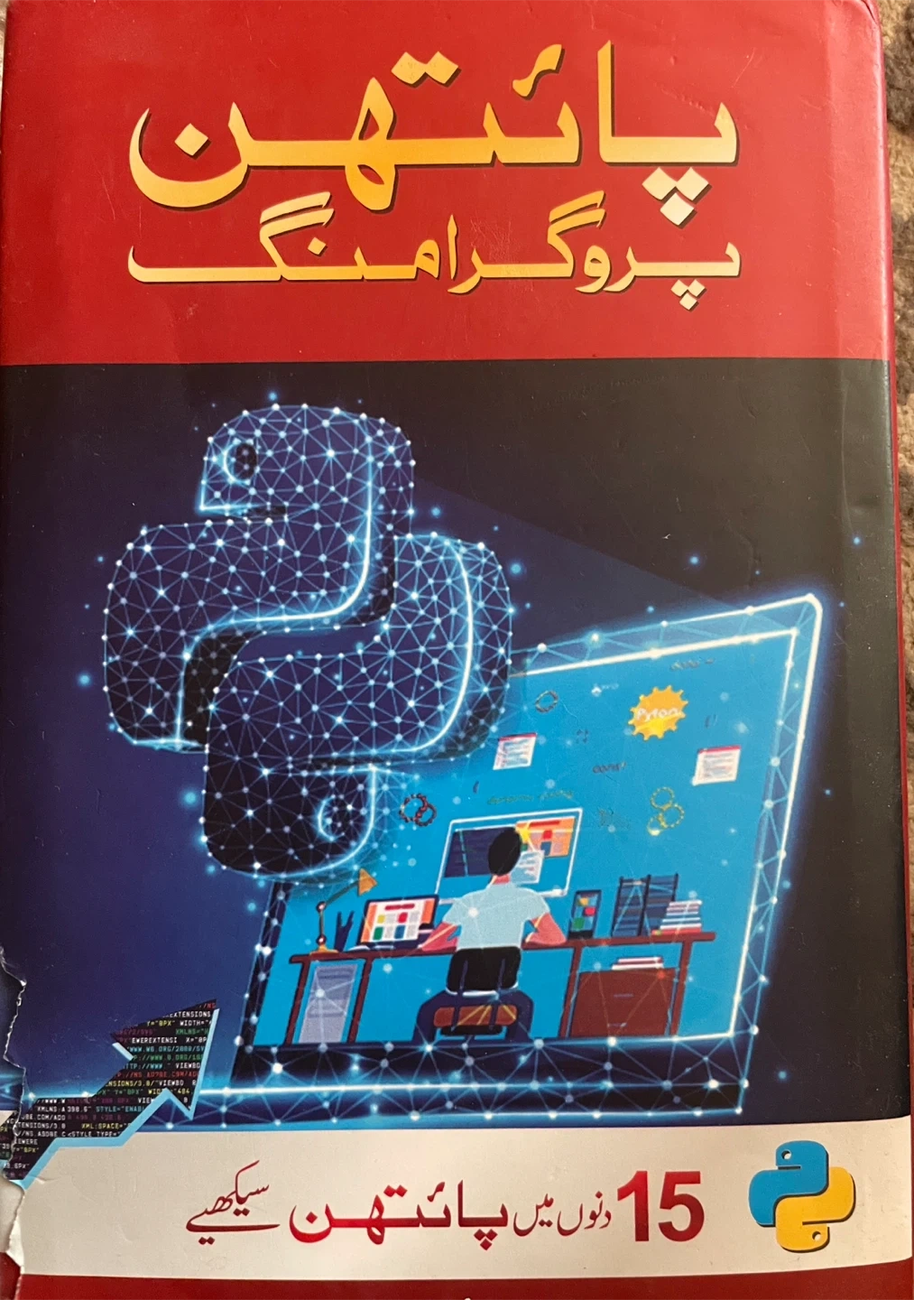 Selling a book about Python programming. The cover has a graphic of the Python logo and a computer setup. Great for anyone looking to learn Python!