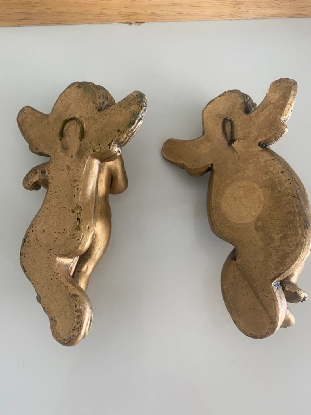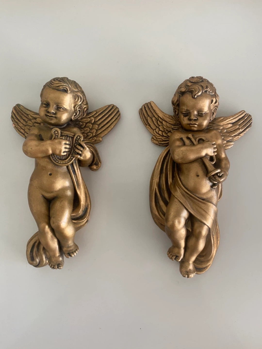 Add a touch of classic charm to your home with this set of two angel wall decorations! They are made of a gold-toned material and each feature a solid metal loop on the back for easy hanging. One angel is playing a harp, while the other is playing a trumpet. Each measures approximately 5 inches in height.These are 90 yrs old from Austria , pick up in Newmarket