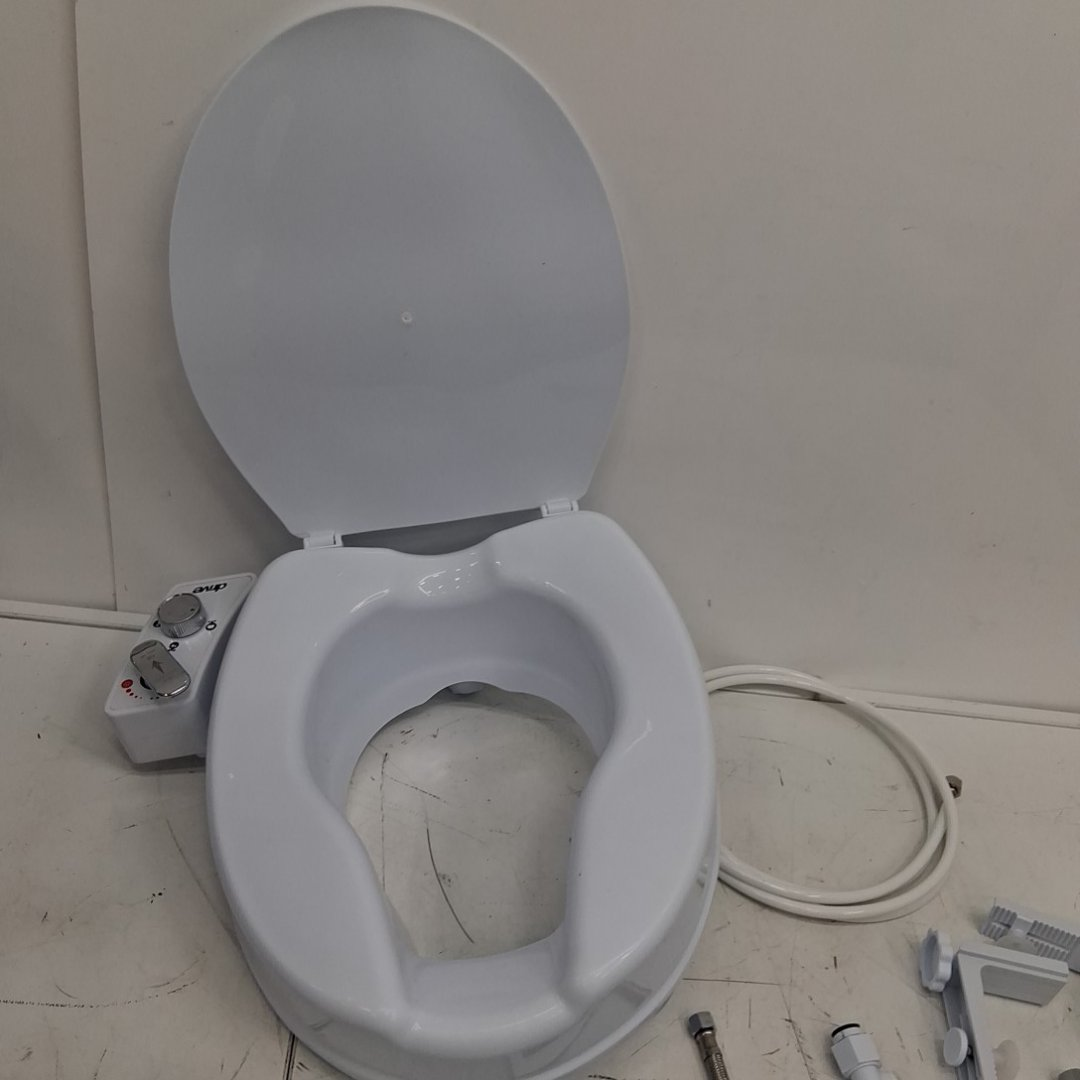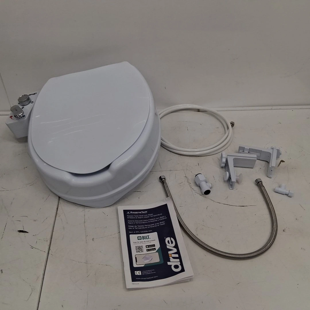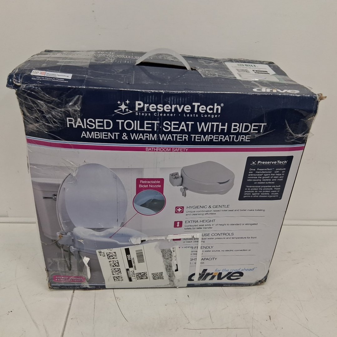 I'm selling a DRIVE PreserveTech Raised Toilet Seat with Bidet, providing an extra 4 inches of height for added comfort and convenience. This item is new and includes ambient & warm water temperature settings.