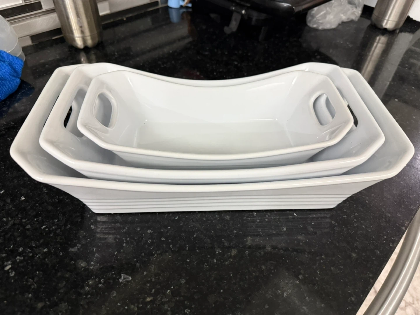 Selling a set of three white serving trays. They are in great condition and perfect for serving appetizers or snacks at your next gathering. The trays nest inside each other for easy storage. They are white and have handles on the sides