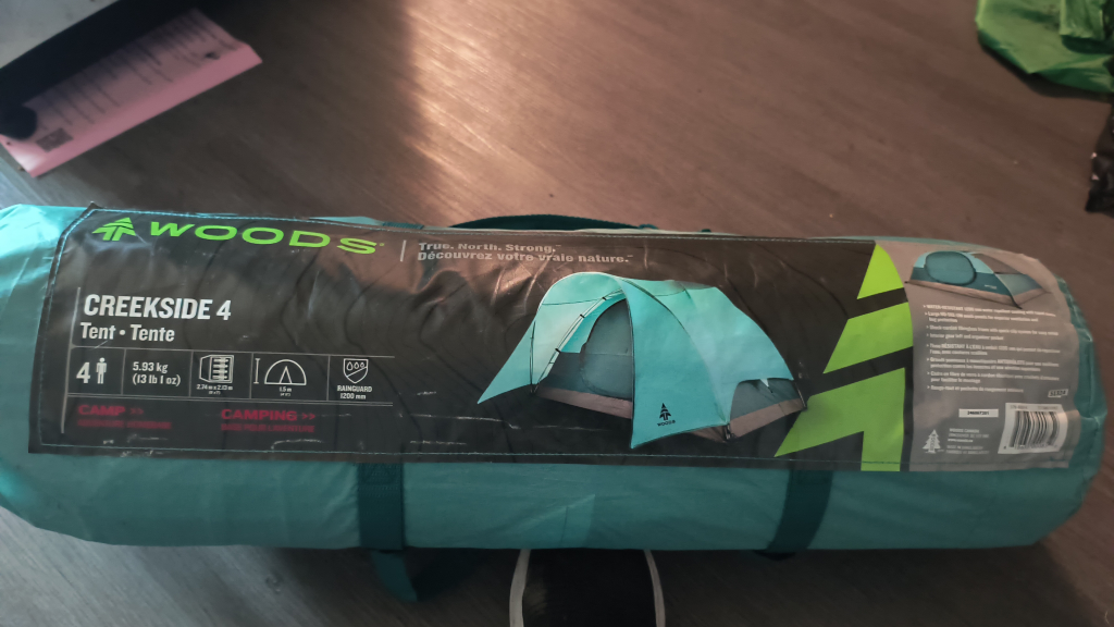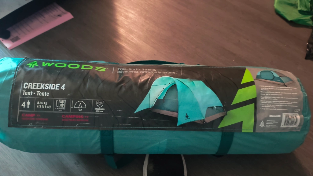 Selling a Woods Creekside 4 tent, perfect for your next camping adventure! This tent comfortably sleeps 4 people. It's lightweight at 5.93 kg (13 lb 1 oz) and offers a rain guard of 1200 mm