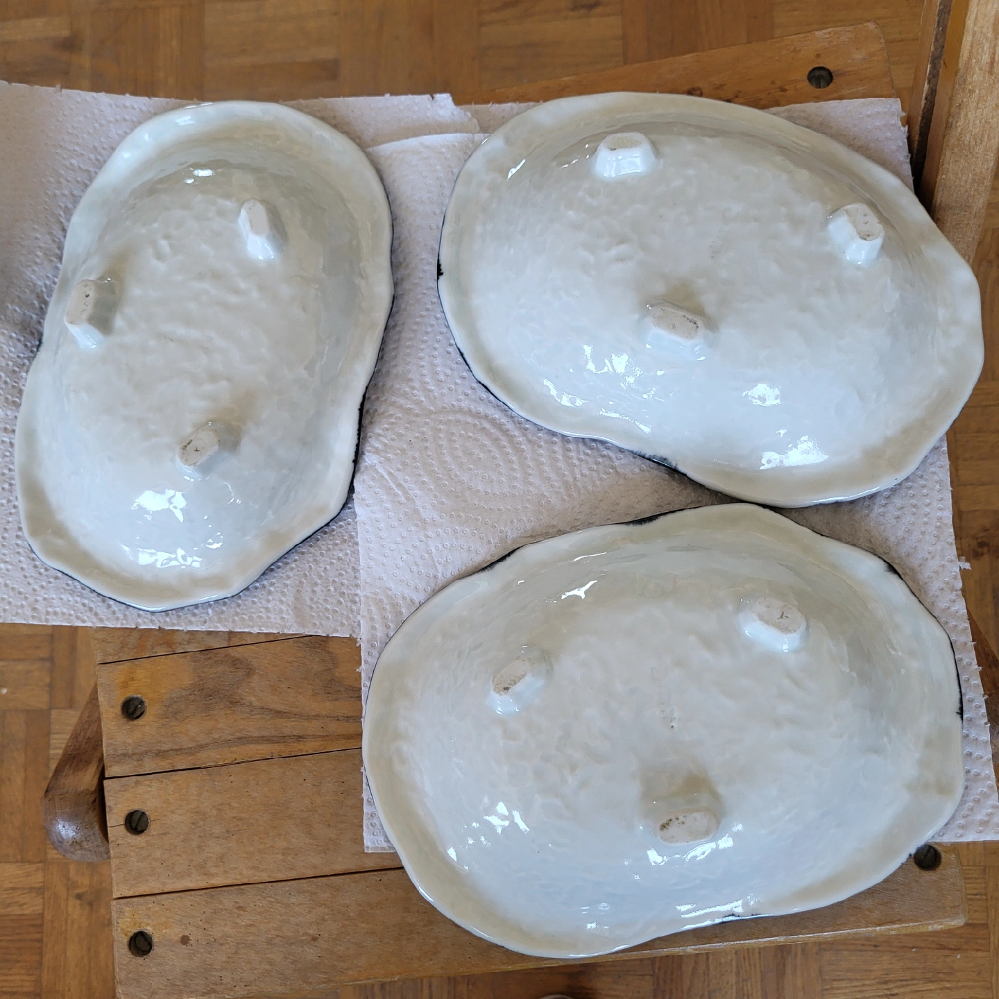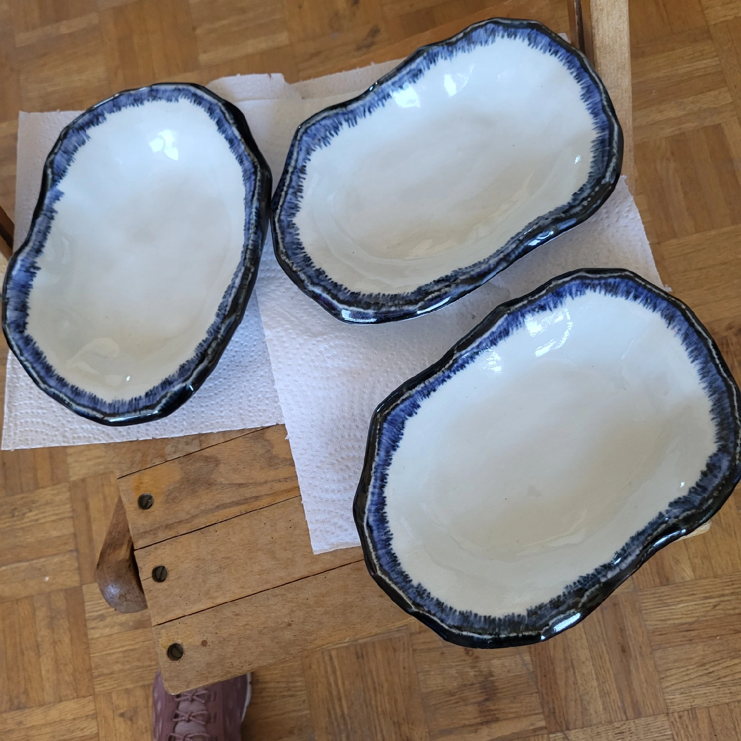 215Selling a set of three unique, handmade ceramic bowls. They feature a lovely white glaze with a distinctive blue rim. Perfect for serving snacks, dips, or as decorative pieces in your home. They have little feet on the bottom!