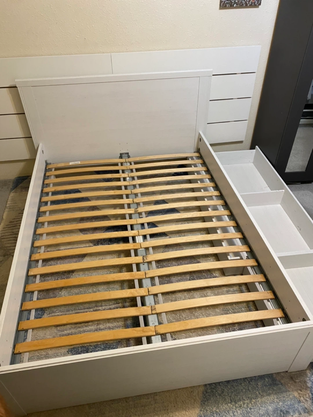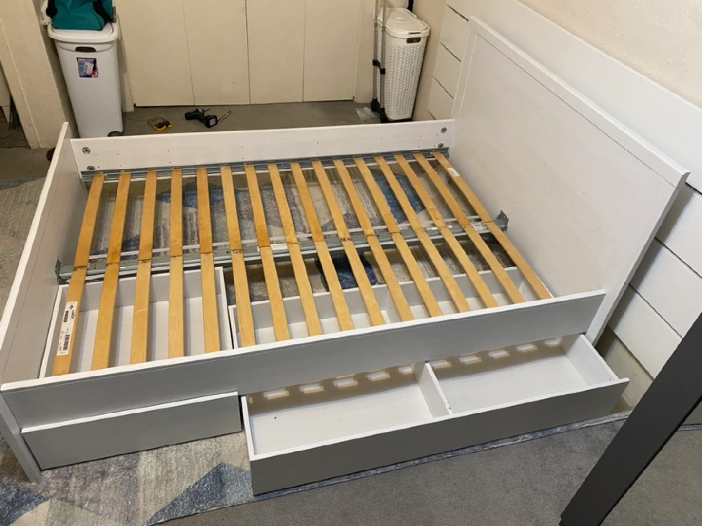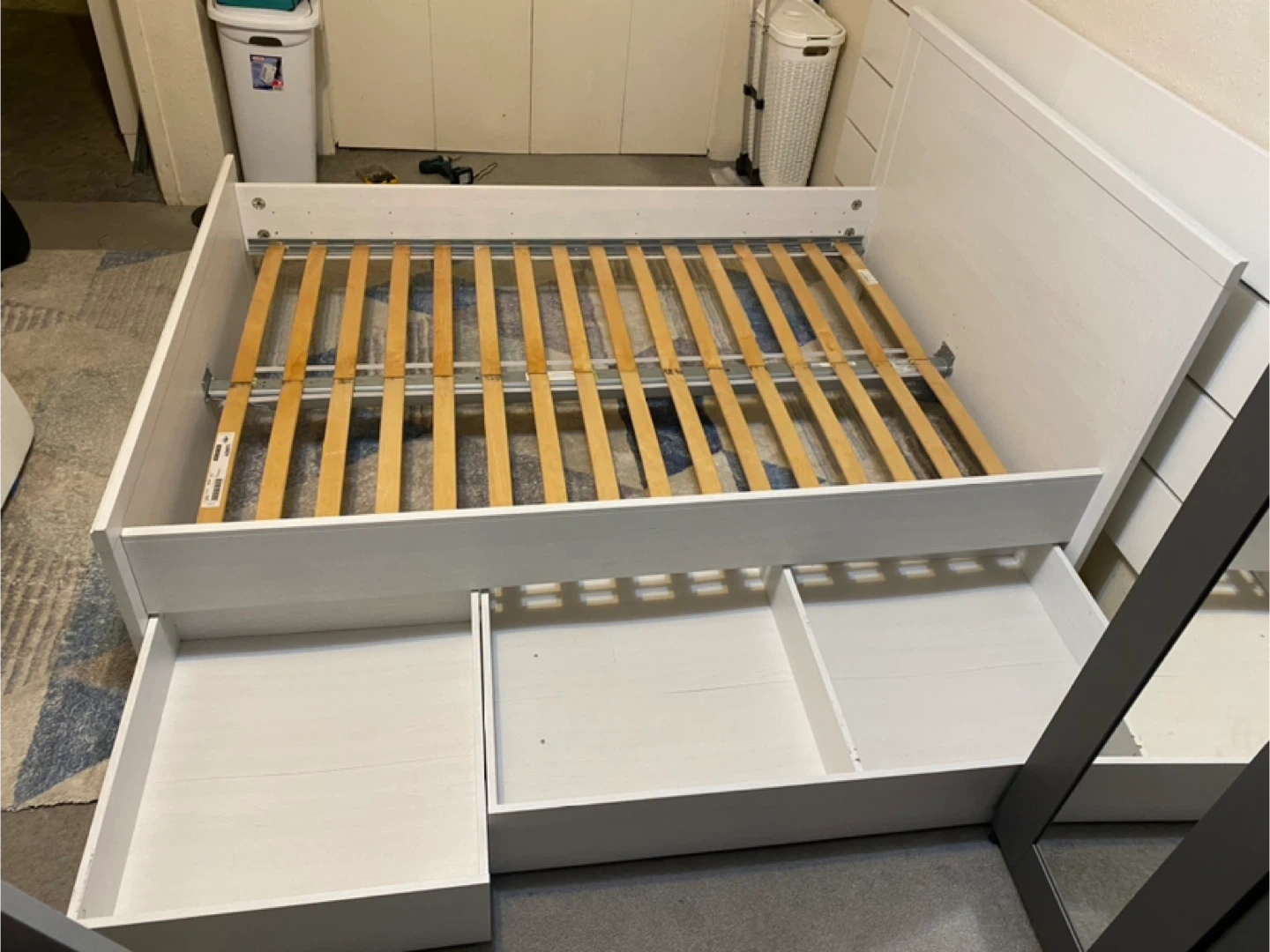 Selling an IKEA bed frame with storage drawers! It's in very good condition and ready for a new home. Perfect for maximizing space in smaller rooms double/full size .smoke and pet free . Pick up near surrey centre station or can deliver and assemble for extra.