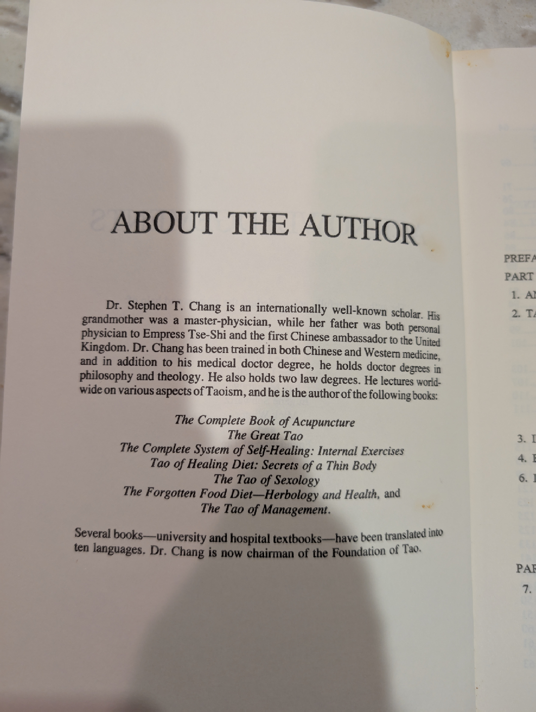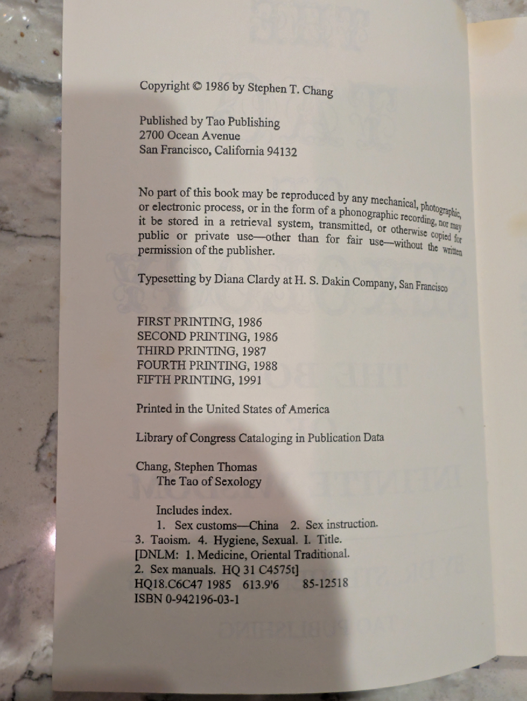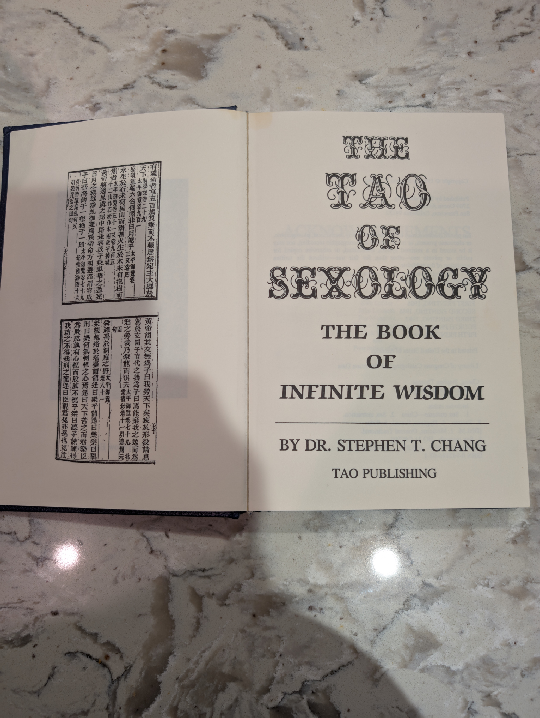 Selling The Tao of Sexology: The Book of Infinite Wisdom by Dr. Stephen T. Chang. This is a hardcover book published by Tao Publishing. Copyrighted in 1986.