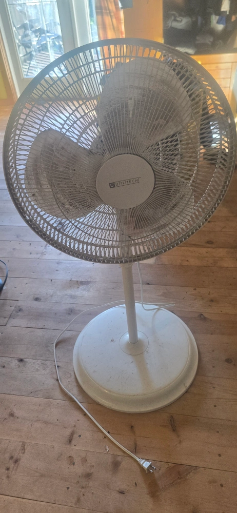 Selling a white stand fan from Utilitech. It's in used condition, perfect for cooling down during the summer months!