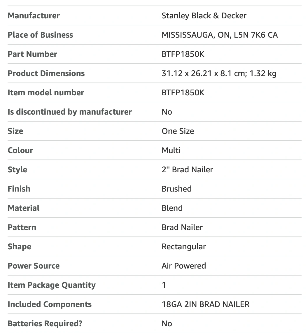 BOSTITCH BTFP1850K 18 gauge Pneumatic 2-inch Brad Nailer offers an adjustable depth guide that sets nails to desired depths quickly and conveniently. This nailer has a tool-free adjustable exhaust cap which conveniently directs exhaust away from the user, along with a no-mar tip that helps to protect work surfaces. This is a tool commonly used for interior trim, exterior trim, cabinet and furniture, quarter round, paneling, staircases. Includes: Brad Nailer, 1/4" (6.35mm) Air Fitting, and Carrying Case.