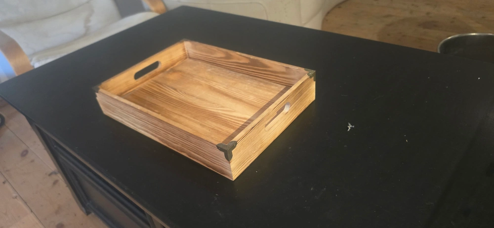 Selling a wooden serving tray with handles. It has a rustic look with metal corner accents. Perfect for serving breakfast in bed or carrying snacks to the living room. In good condition!