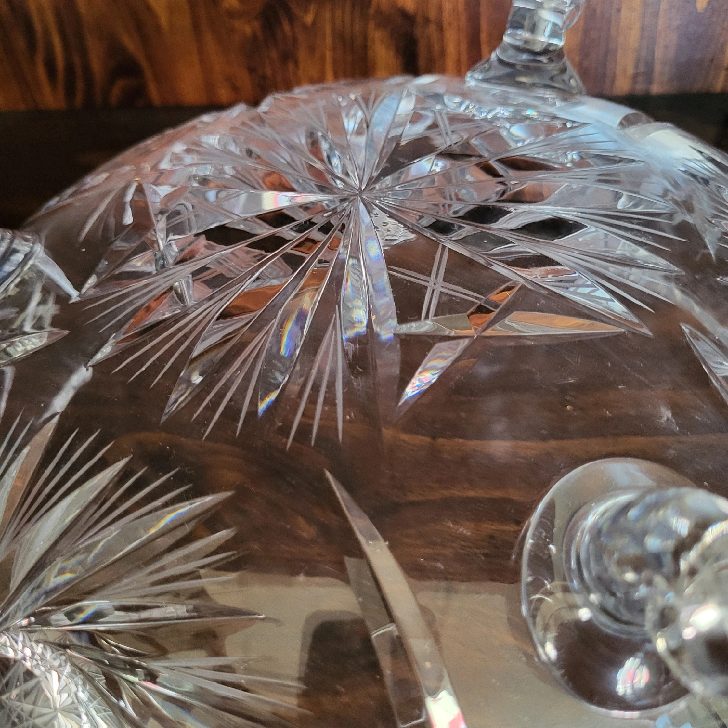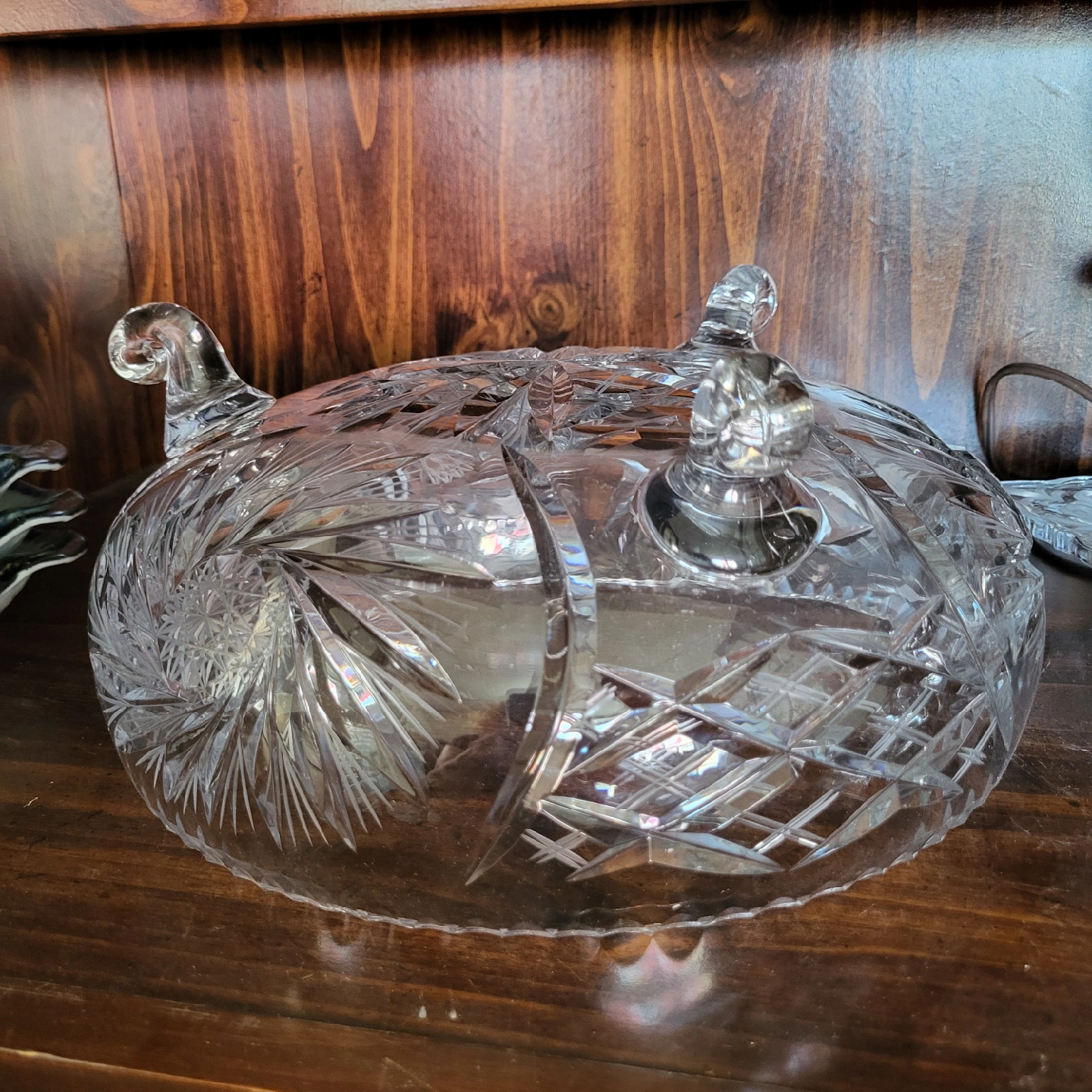 Beautiful crystal bowl with a detailed design and three legs. It is in great condition and would look lovely as a centerpiece or for serving