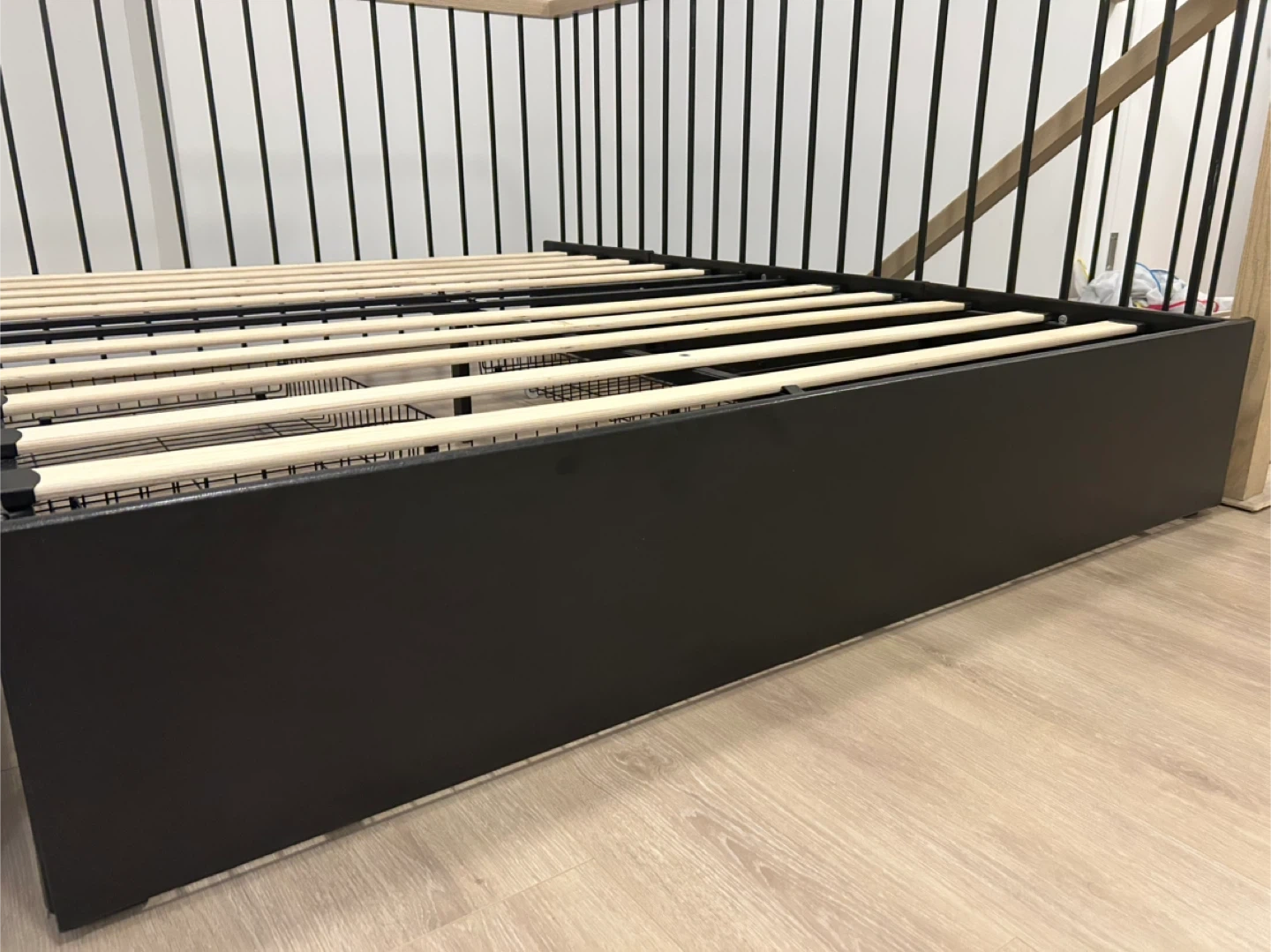 144Selling a queen size bed, like new. It comes with handy storage drawers built right in, perfect for keeping your space tidy. It features a metal bed frame that's wrapped all around with textured black faux leather upholstery to fit various types of home decor. Assembly instructions included.