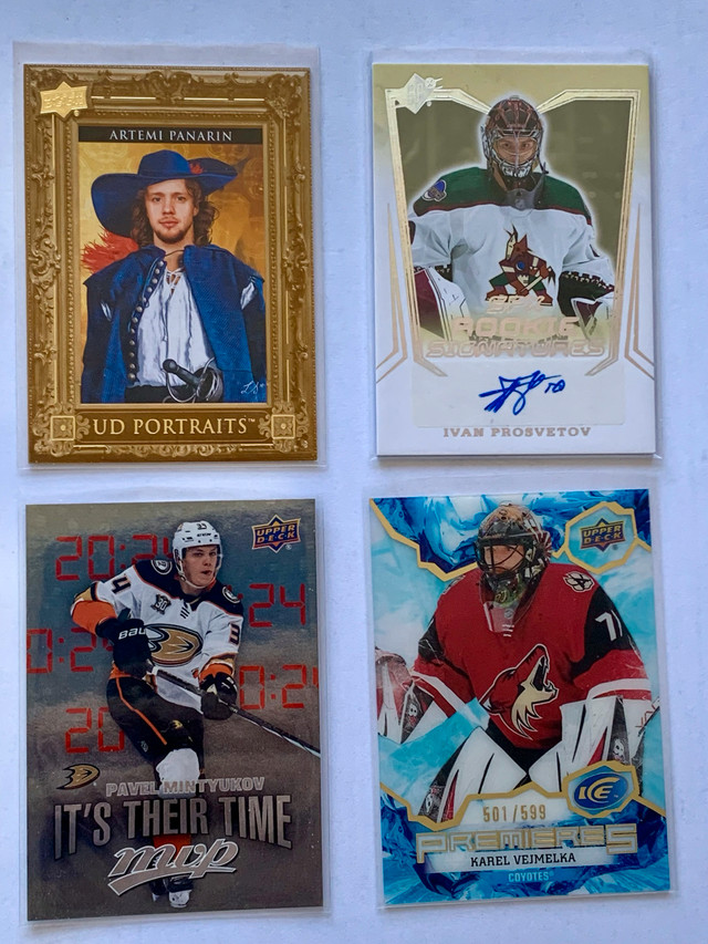 Here are 24 NHL hockey cards up for grabs. This collection includes one autographed card and one numbered card, making it a cool find for collectors! The cards are in excellent condition. If the ad's still up, you bet the cards are still available.