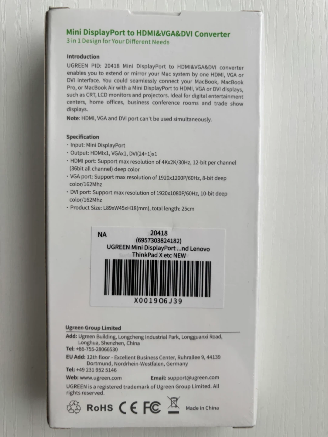 Selling a brand new UGREEN Mini DisplayPort to HDMI/VGA/DVI Converter. It's a 3-in-1 design for your different needs.