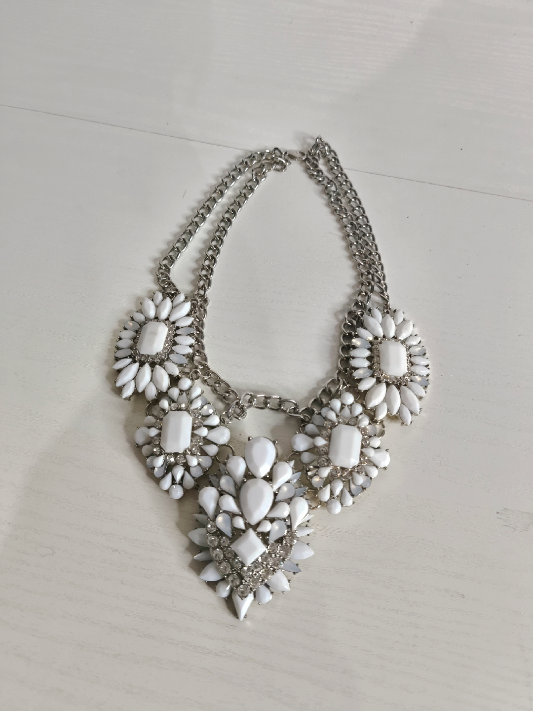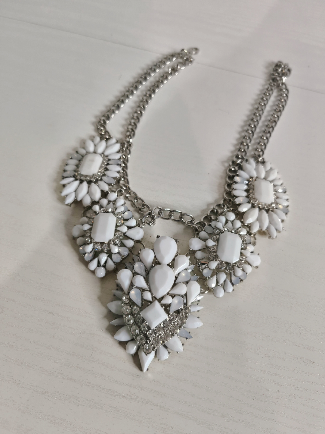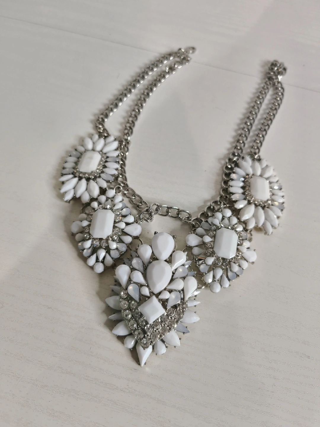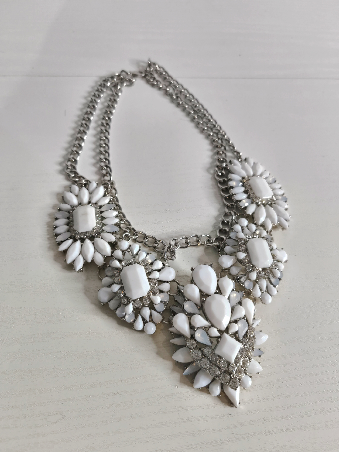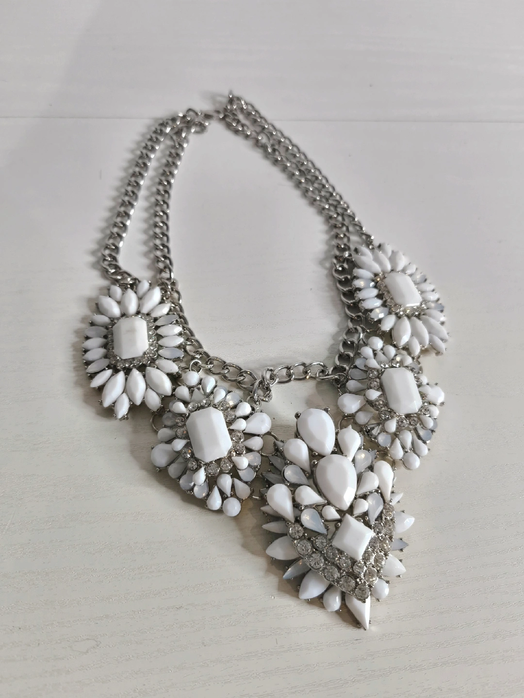 This is a beautiful statement necklace with white stones and a silver-tone chain.