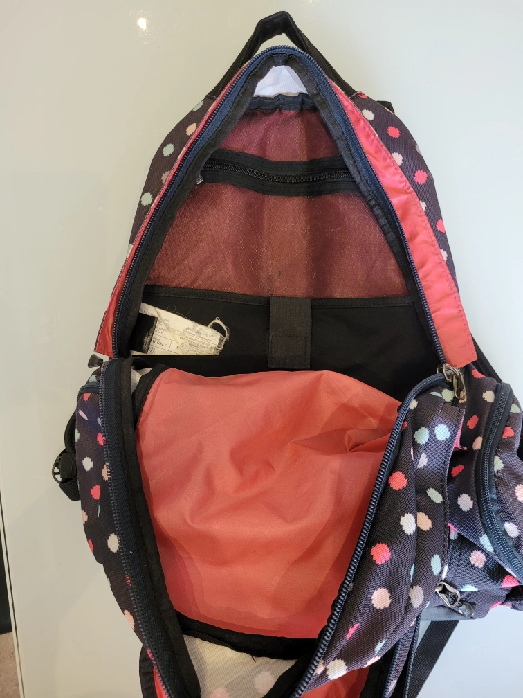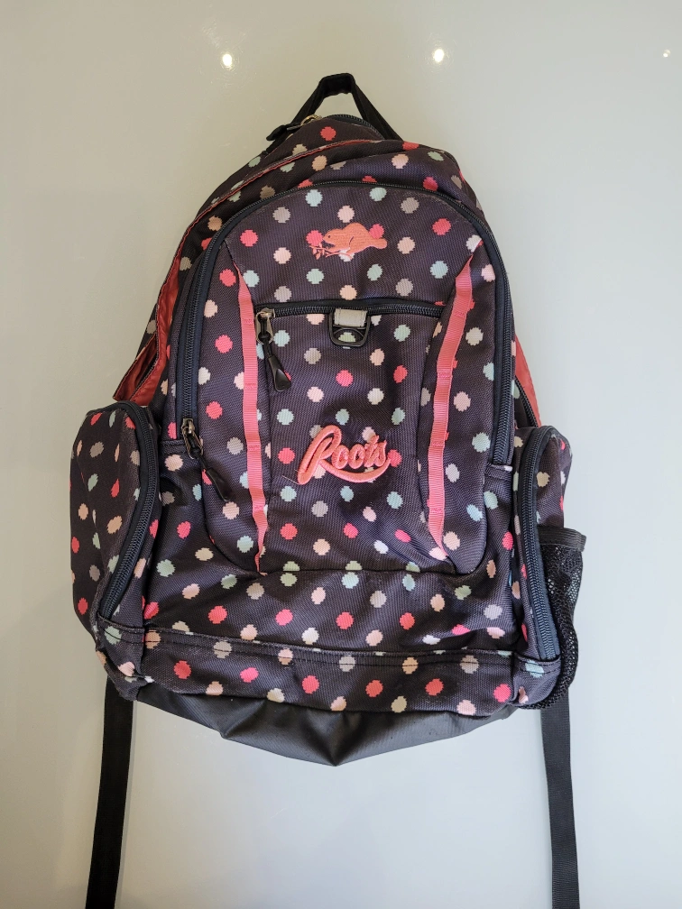 This is a Roots backpack with a cute polka dot pattern. It has a black exterior with colourful polka dots and pink accents. The interior is a bright coral colour. It's in great condition and ready for a new home!