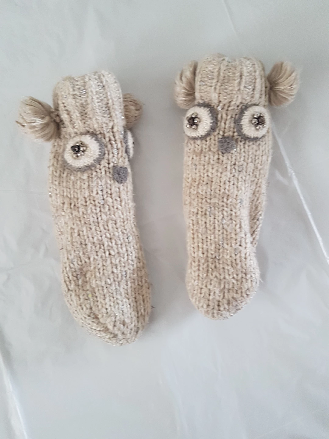Super cute handmade knit booties, perfect for a newborn! They have adorable owl detailing with little ears and beaded eyes. These are in great condition and ready to keep some little toes warm.