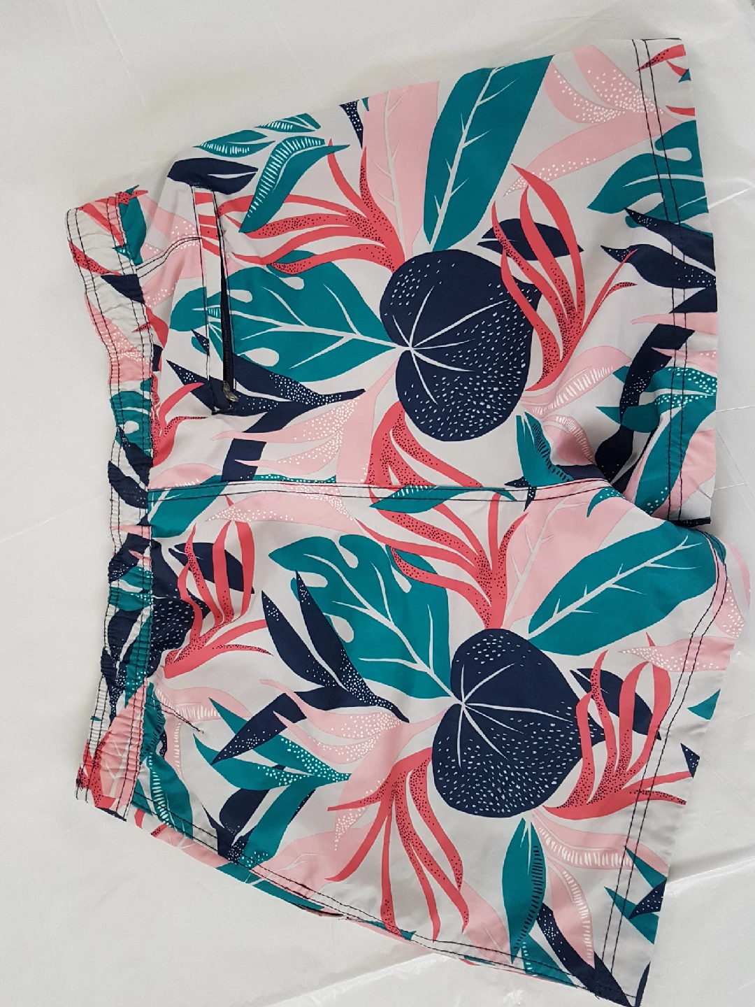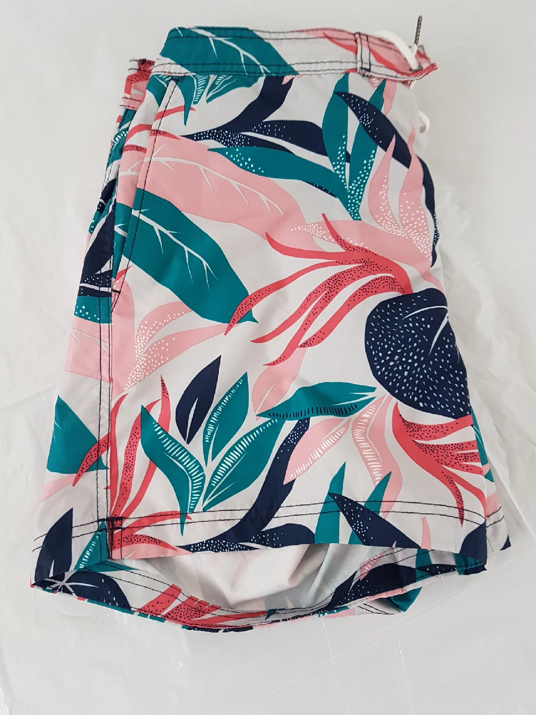 Selling a pair of H&M swim shorts in size M. They feature a fun floral pattern with pink, teal, and navy leaves on a white background. Perfect for the beach or pool!