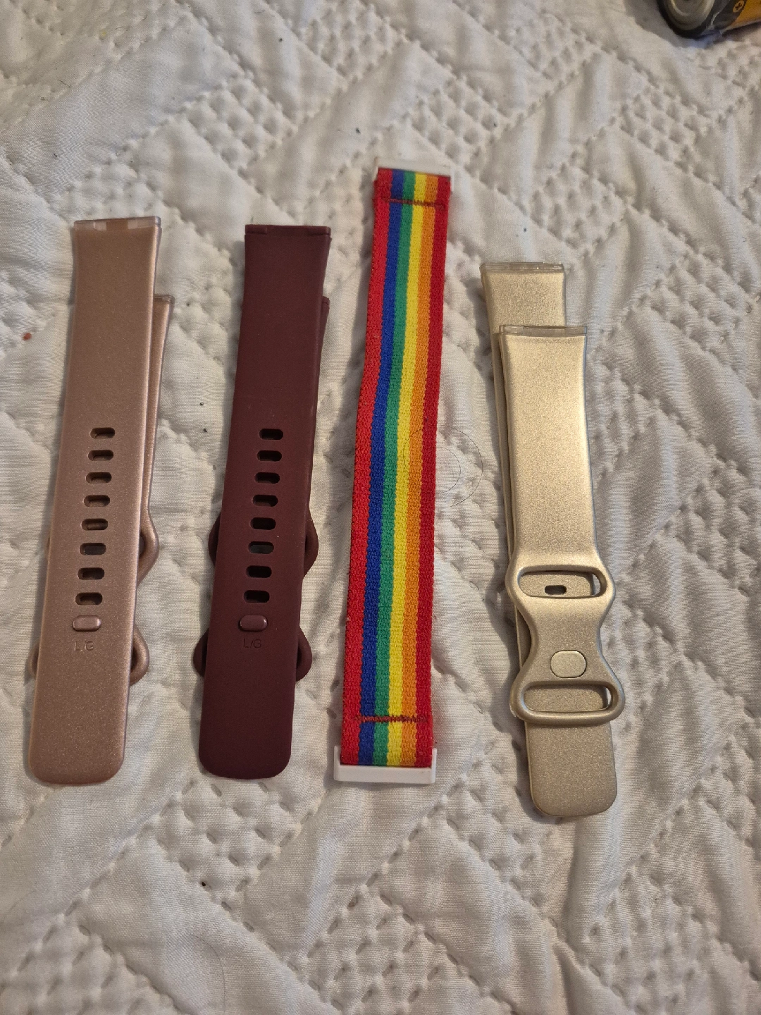 Selling a variety of Fitbit watch bands! There's a rose gold band, a gold band, a burgundy band, and a fun rainbow band. All are in great condition and ready for a new home.