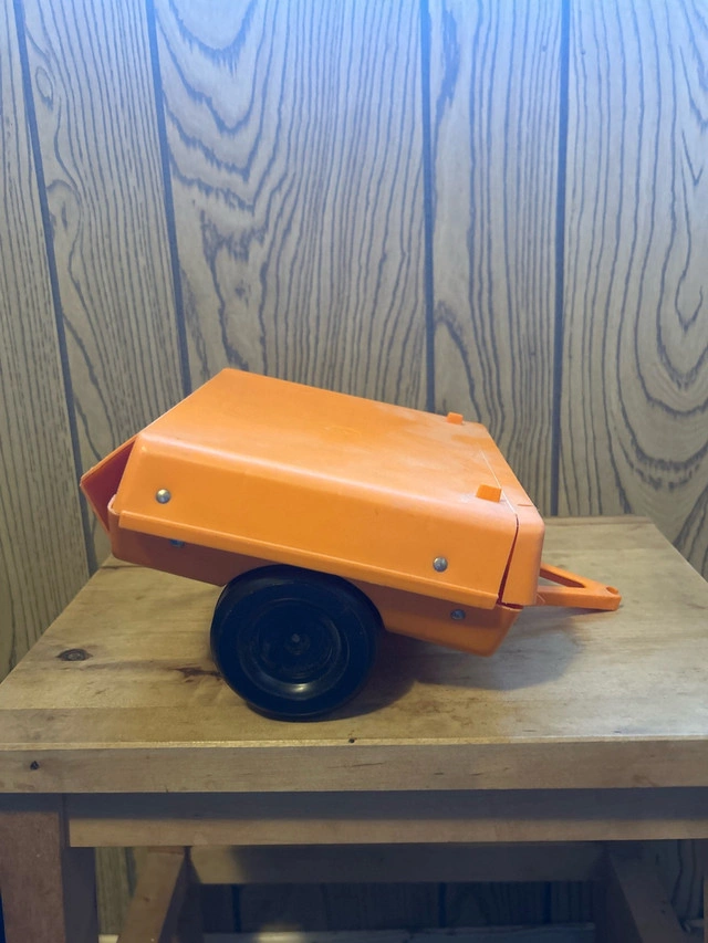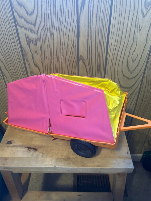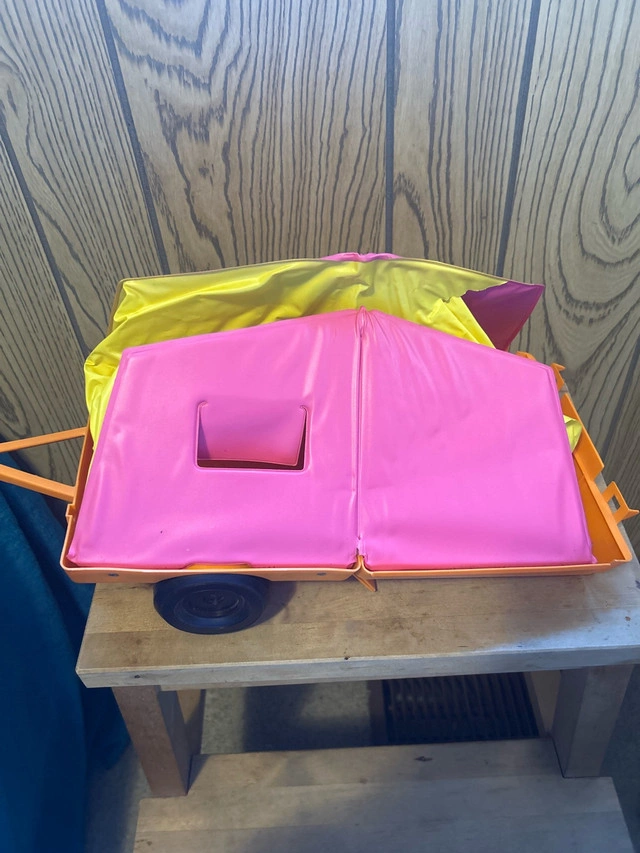 This vintage Barbie pop-up trailer from the 1970s is ready for its next adventure! Though previously loved, it's still packed with retro charm. The trailer features its original bright orange shell and vibrant pink and yellow tent. This toy does show signs of use, which only adds to its nostalgic appeal. Here are some groovy details: * Bright orange hard shell * Classic pink and yellow pop-up tent * Rolling wheels for on-the-go fun If the ad is up, it's available, ready to roll into your collection!