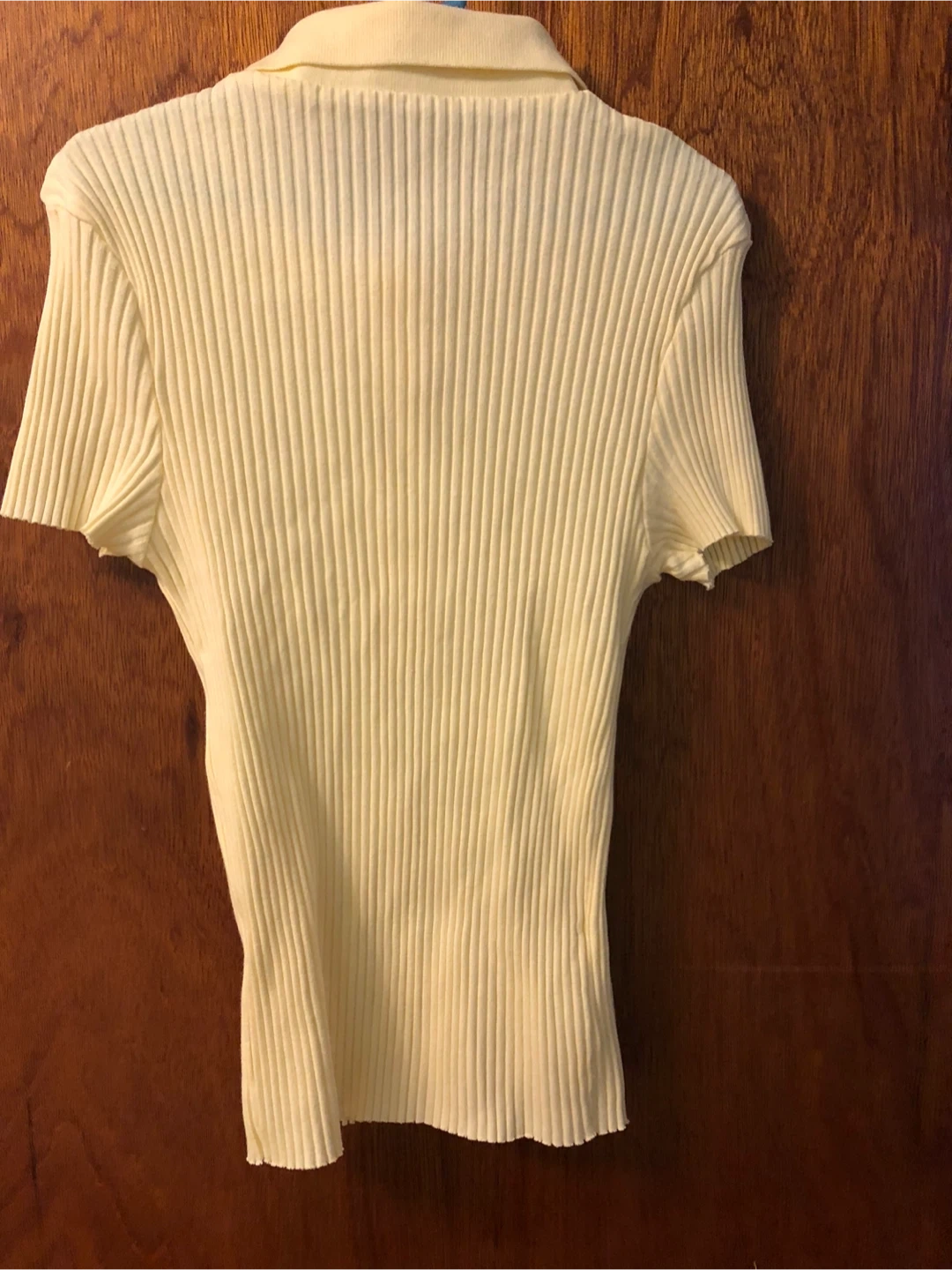 A cute Zara stretchable ribbed knit polo shirt in a lovely light yellow colour. It's a size small and made in Morocco. It's in NEW condition and ready for a new home! Pickup from Christie station during the week days between 4:30pm and 8:00pm