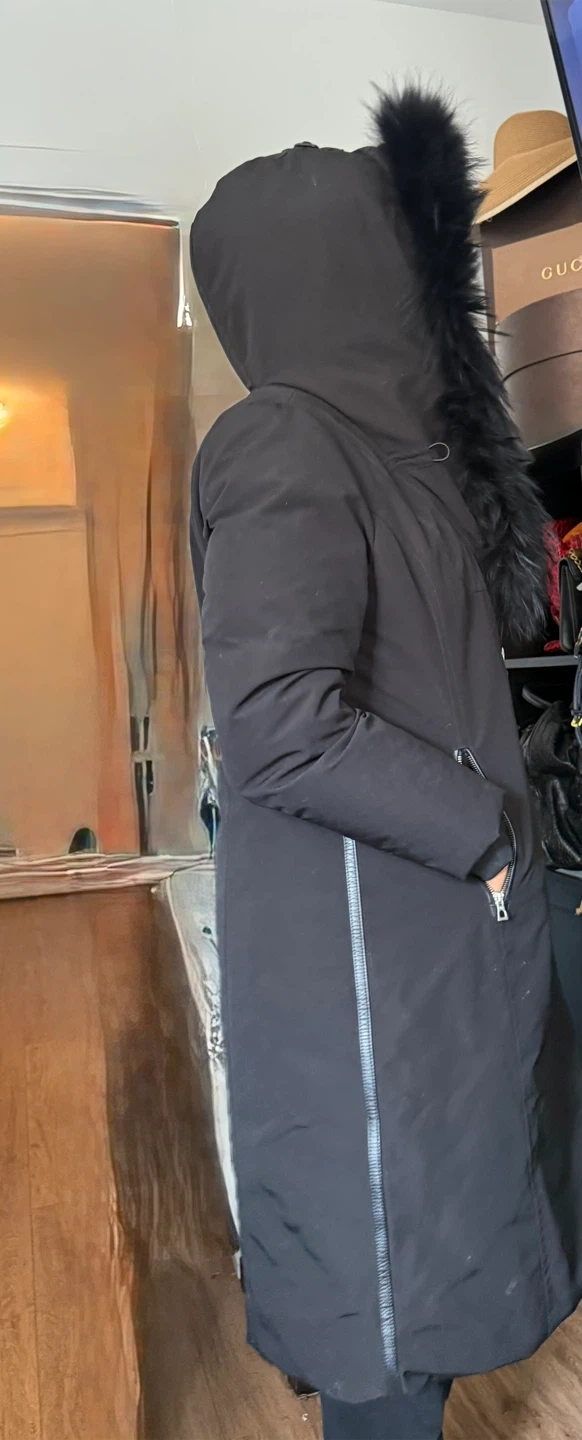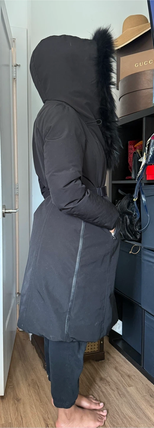 21Selling a RUDZAK black winter coat. It's in great condition and perfect for the cold Canadian winters! It features a fur-trimmed hood and a stylish, asymmetrical zipper. A warm and fashionable choice for the season