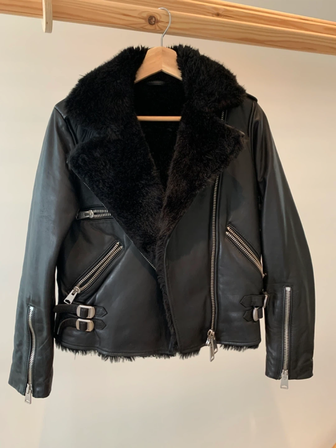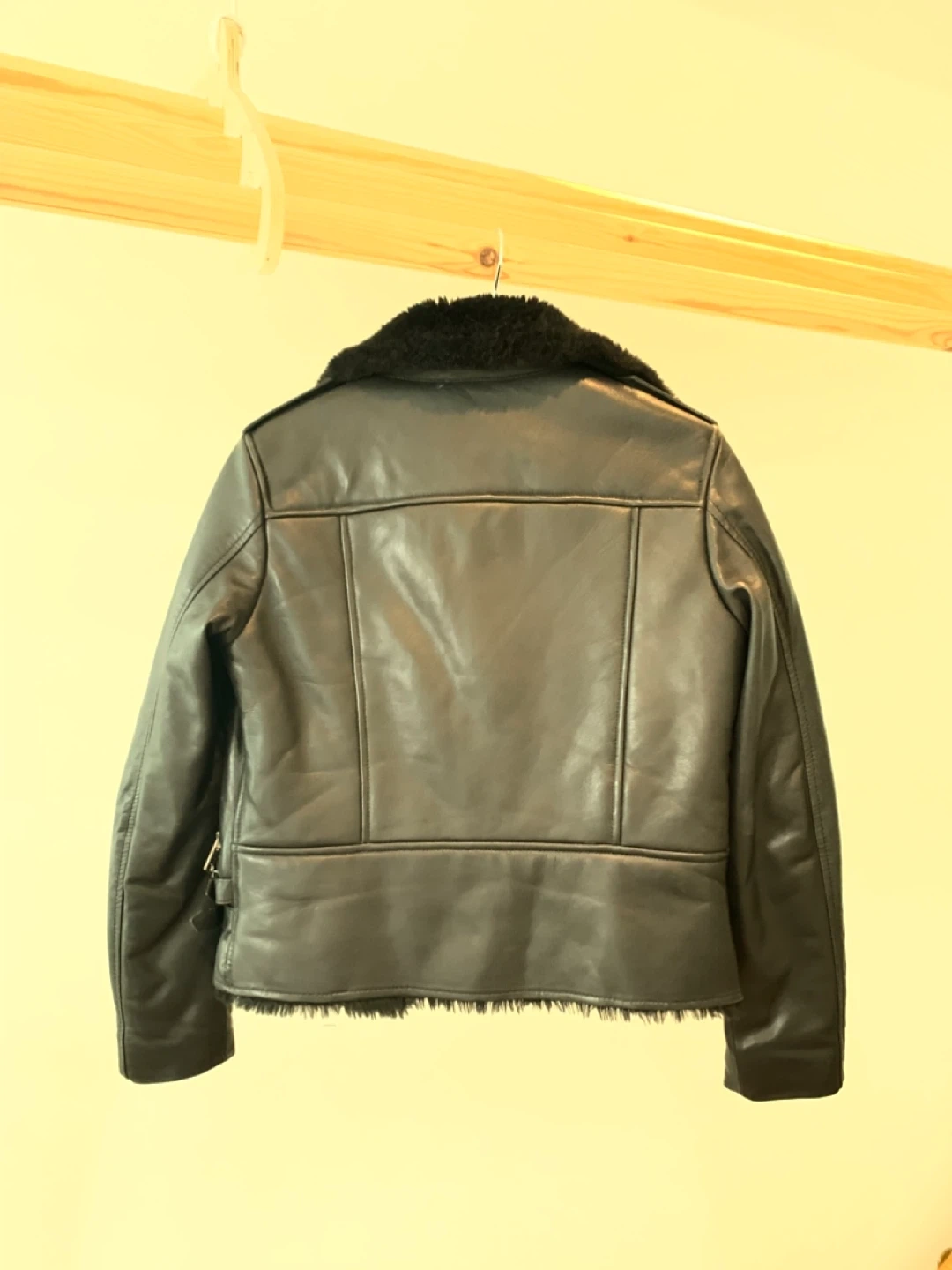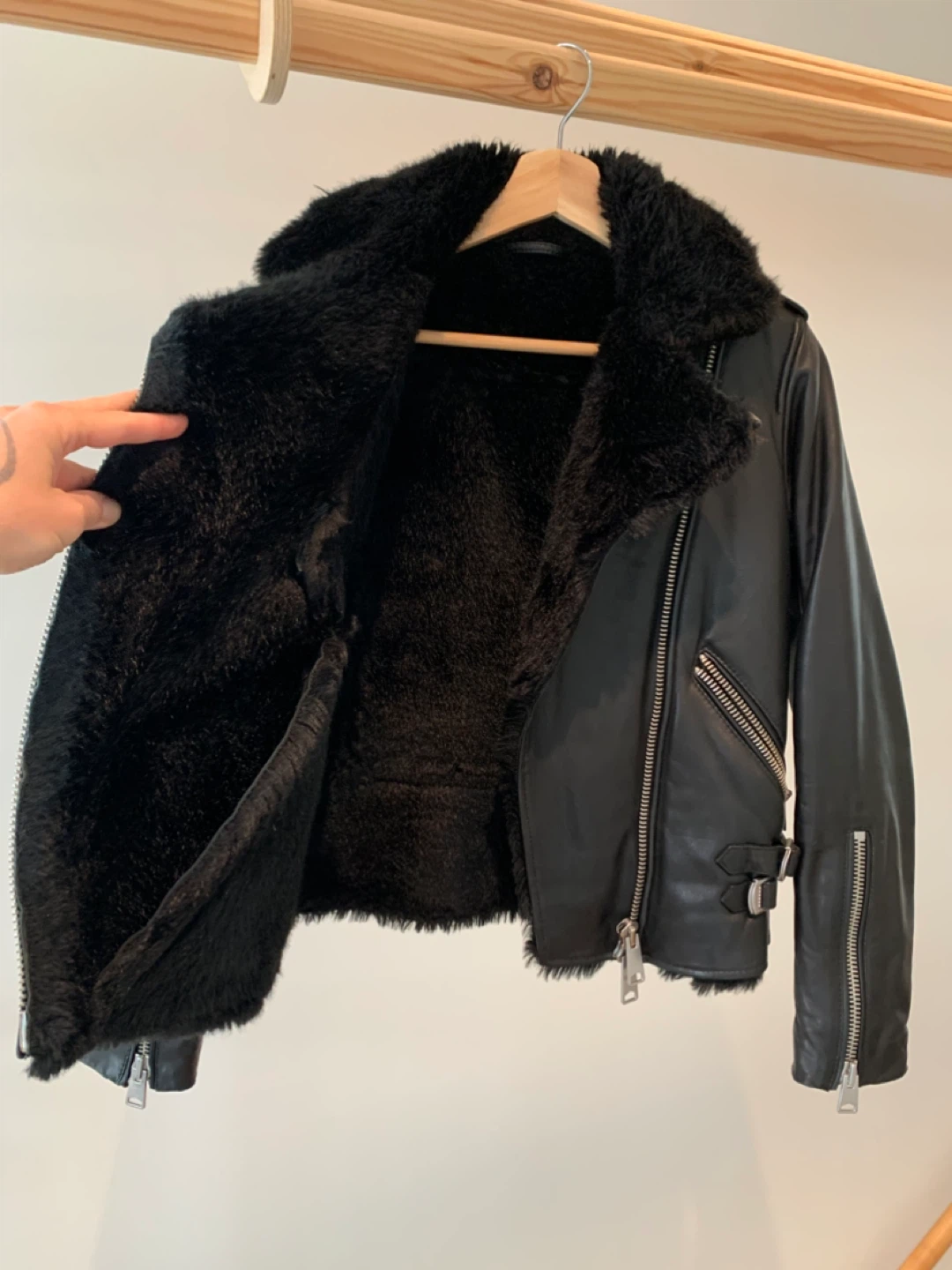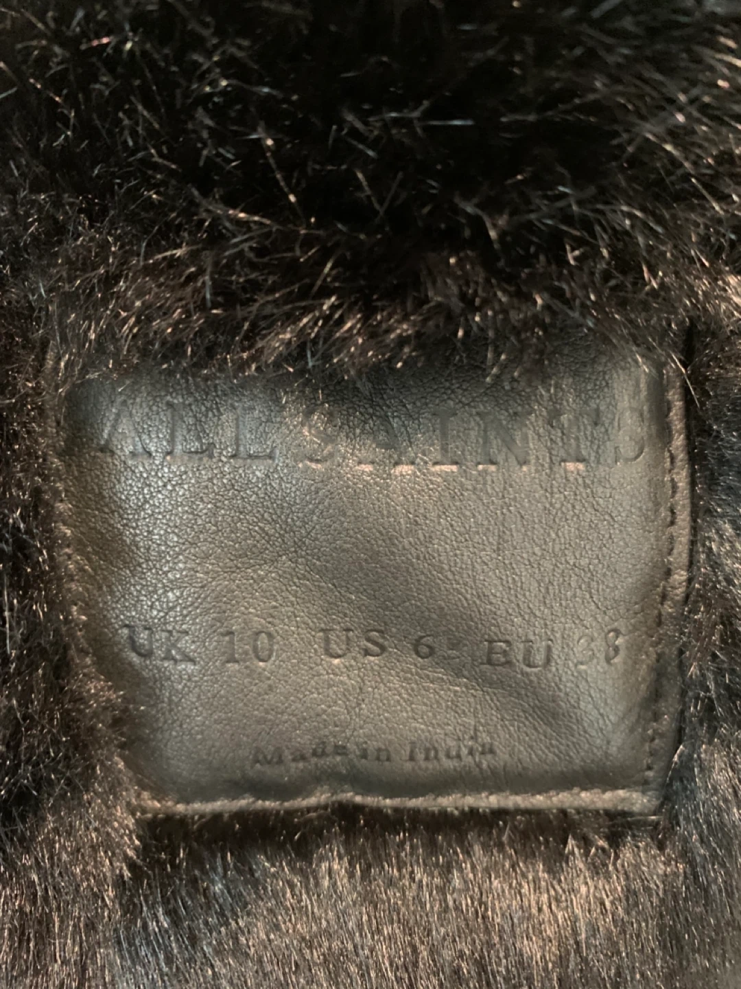 It's a size US 6. The jacket features a cozy faux fur collar and lining. It is scent-free, and from a clean and smoke-free environment.