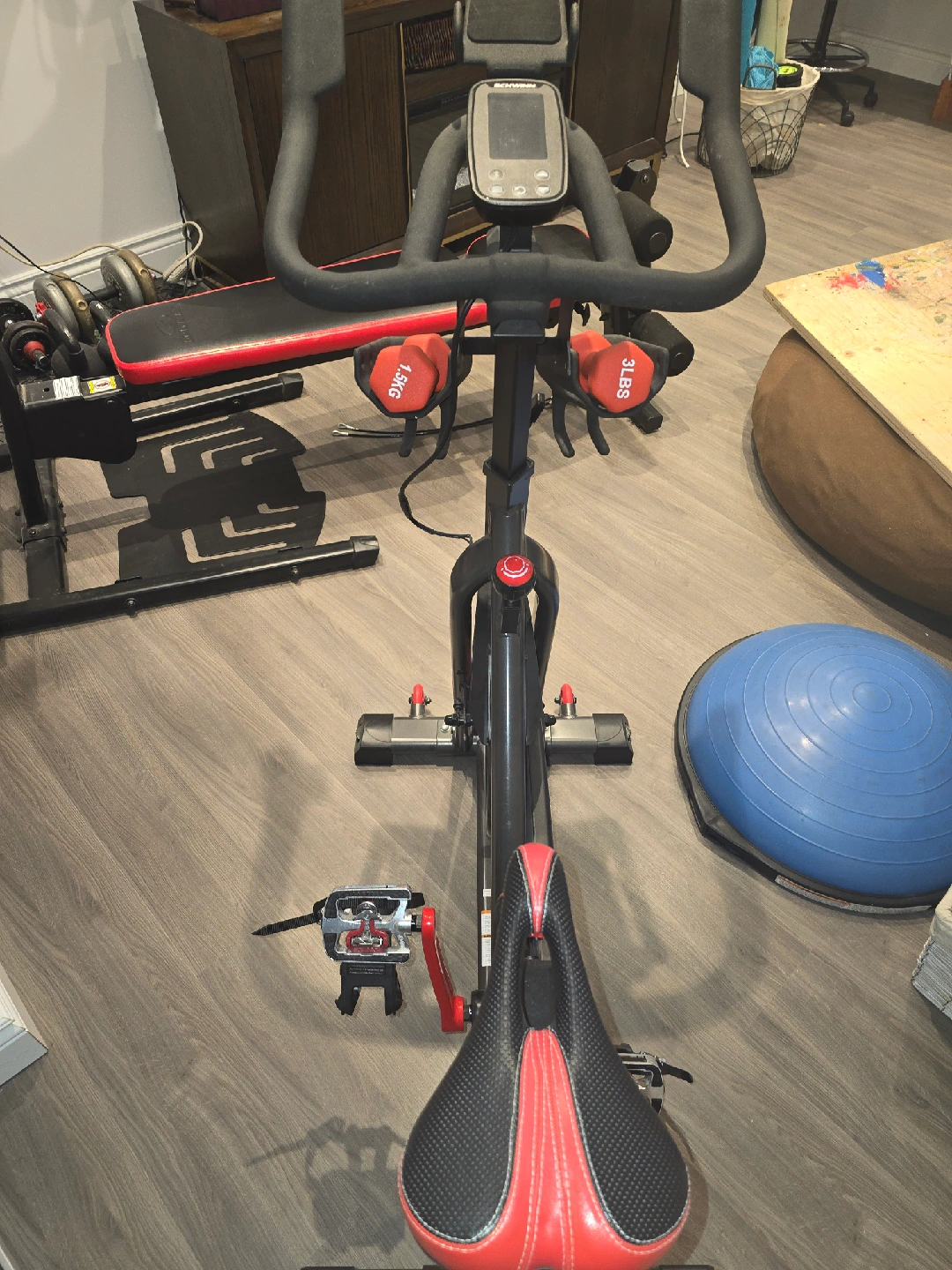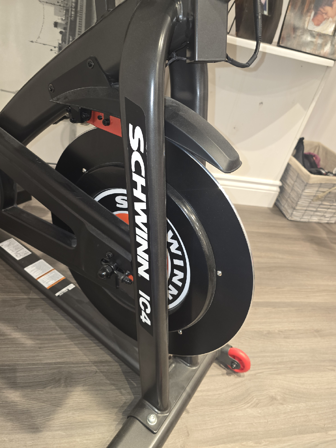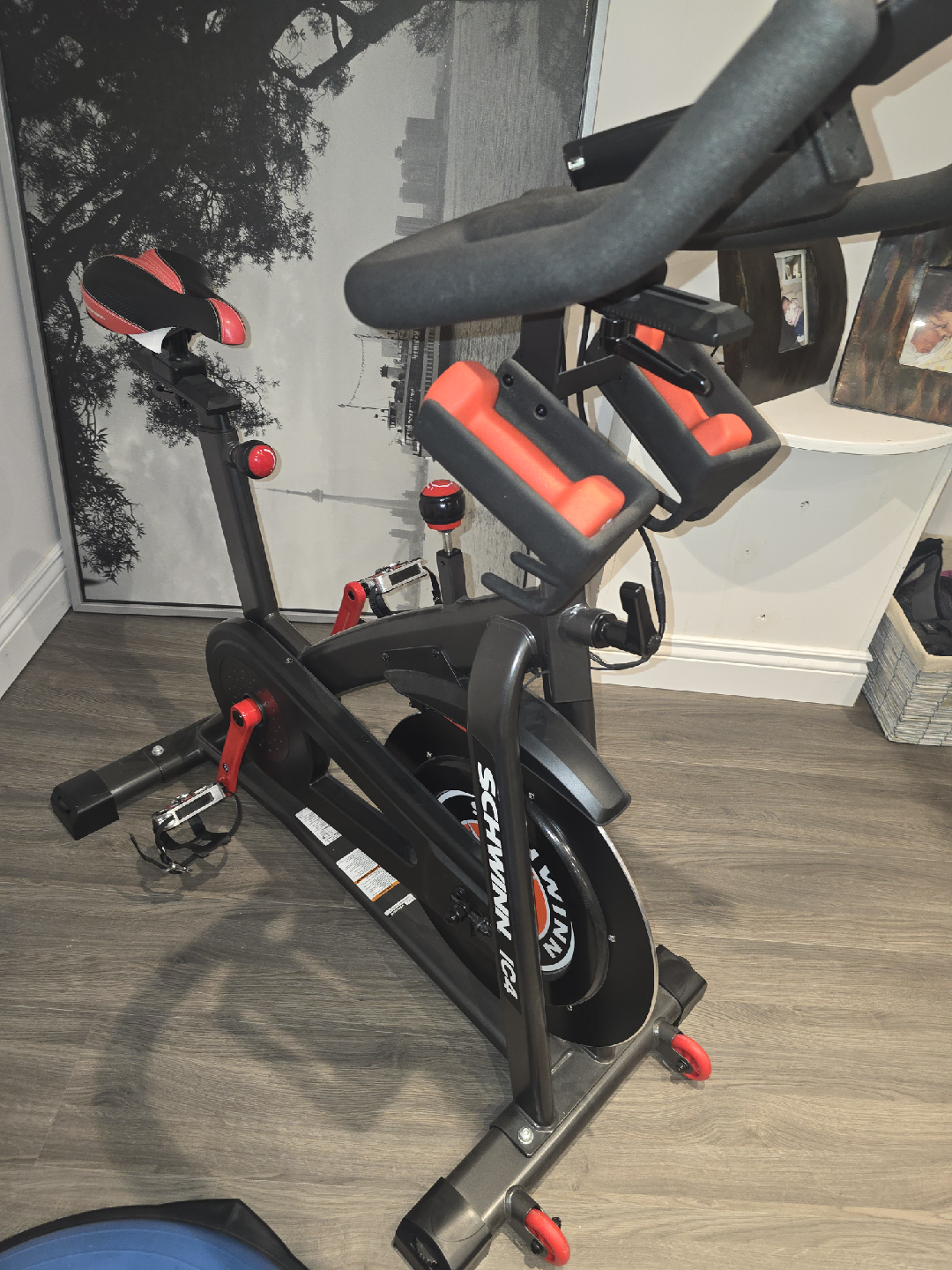 Schwinn IC4 indoor cycling bike in great condition! Comes with a set of weights (1.5kg and 3lbs) attached to the bike. The bike features a sleek design and is perfect for at-home workouts. The seat has a red and black design. Ready for a new home!