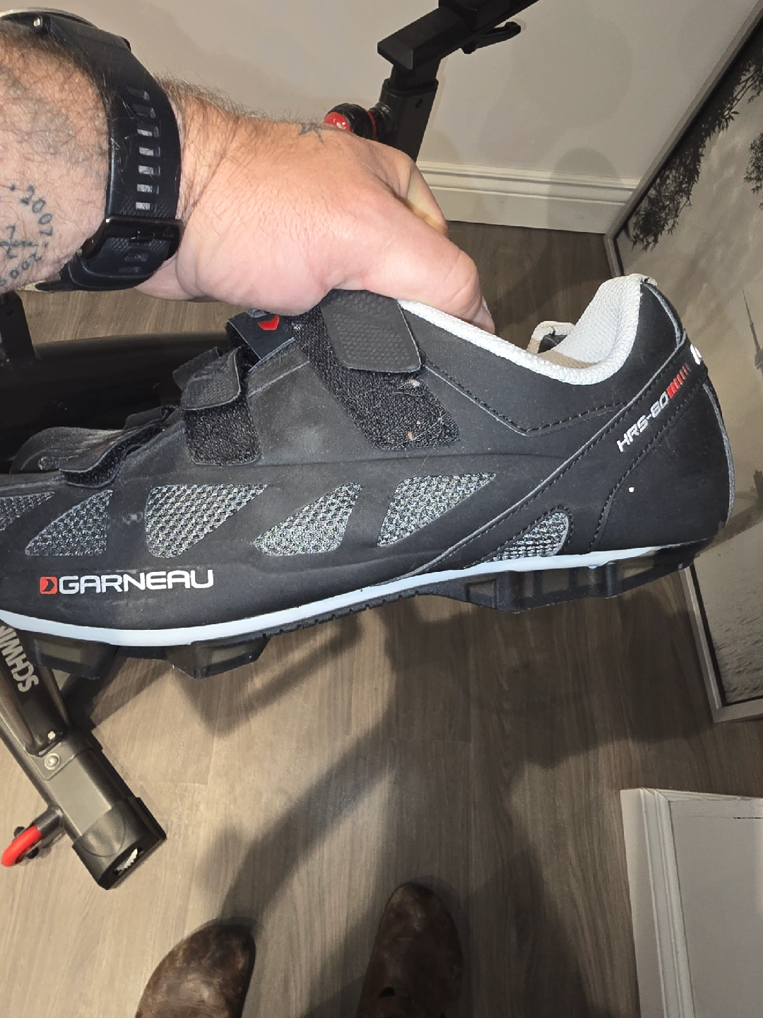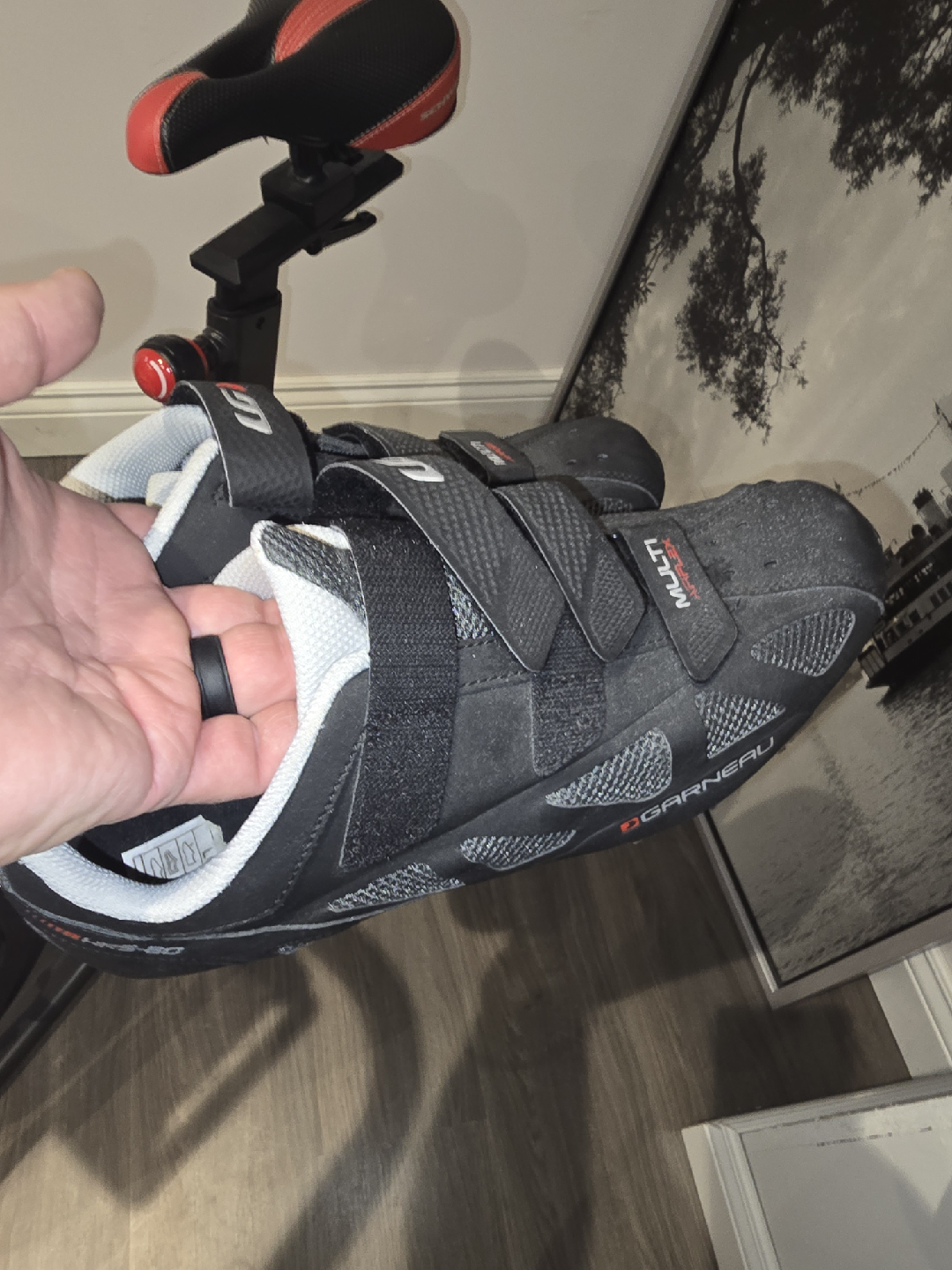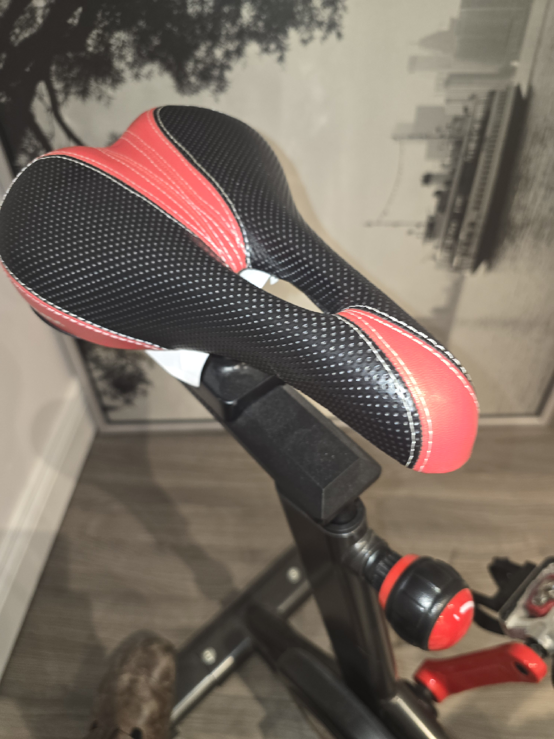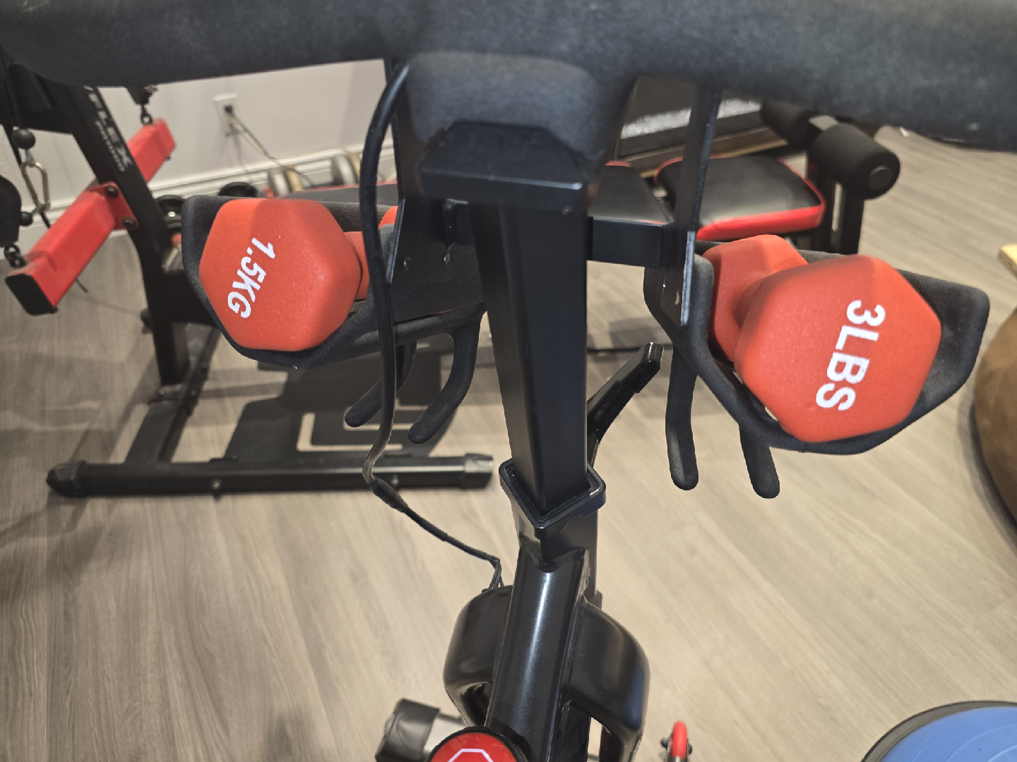 Schwinn IC4 indoor cycling bike in great condition! Comes with a set of weights (1.5kg and 3lbs) attached to the bike. The bike features a sleek design and is perfect for at-home workouts. The seat has a red and black design. Ready for a new home!