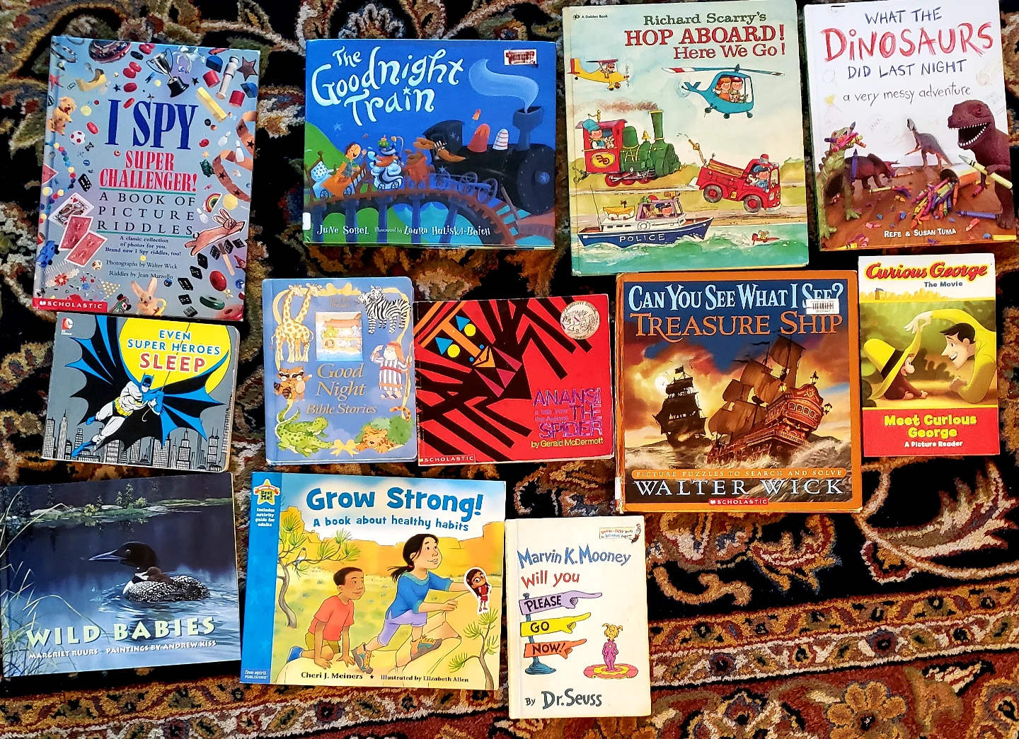 Make an offer for this bundle of children's books! Includes titles like I Spy Super Challenger, The Goodnight Train, Richard Scarry's Hop Aboard!, What the Dinosaurs Did Last Night, Curious George, and more! Perfect for bedtime stories or early readers