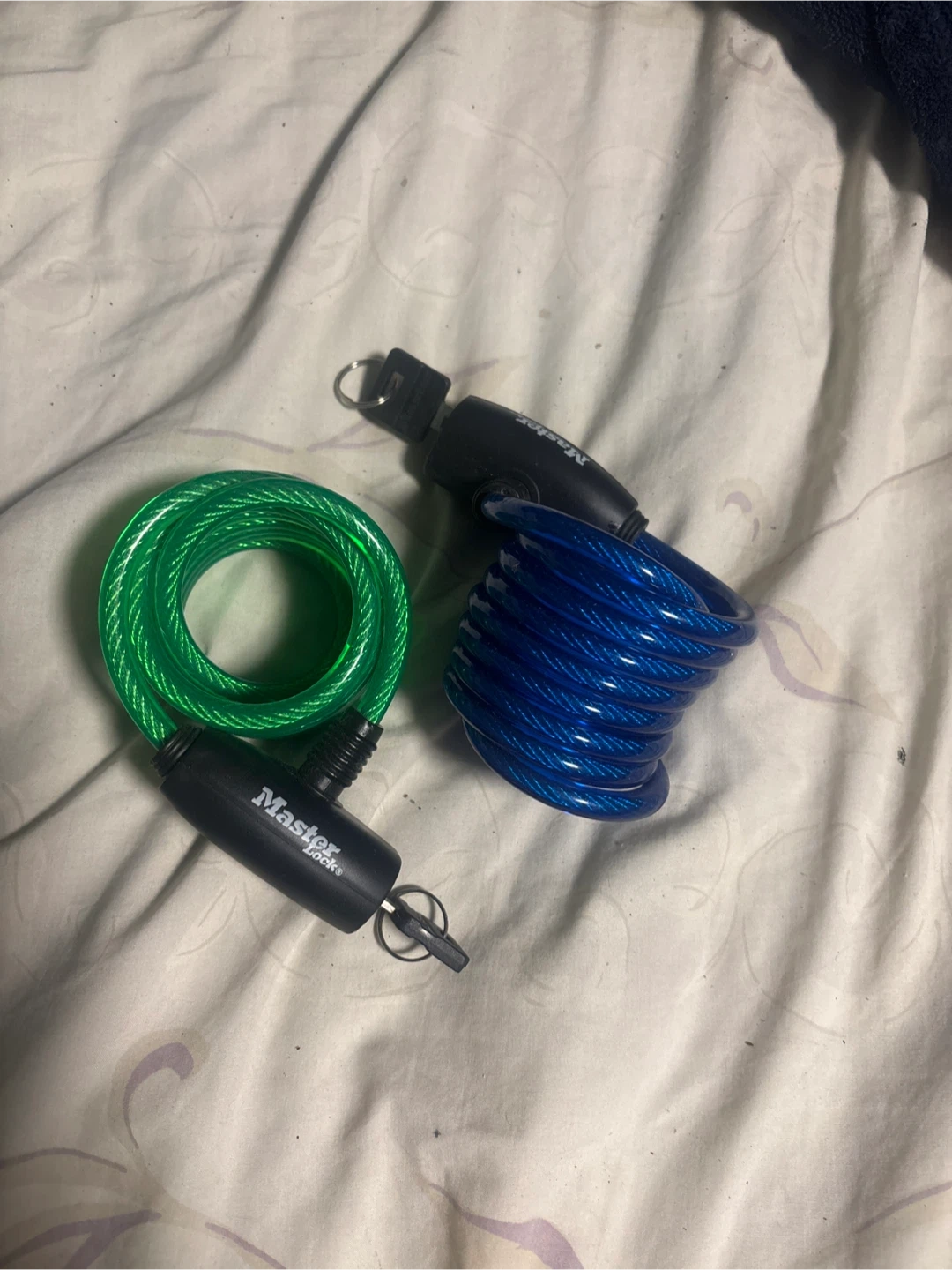 60Selling two Master Lock cable bike locks. One is green and the other is blue. Both come with their own keys. $12 each or $20for both.