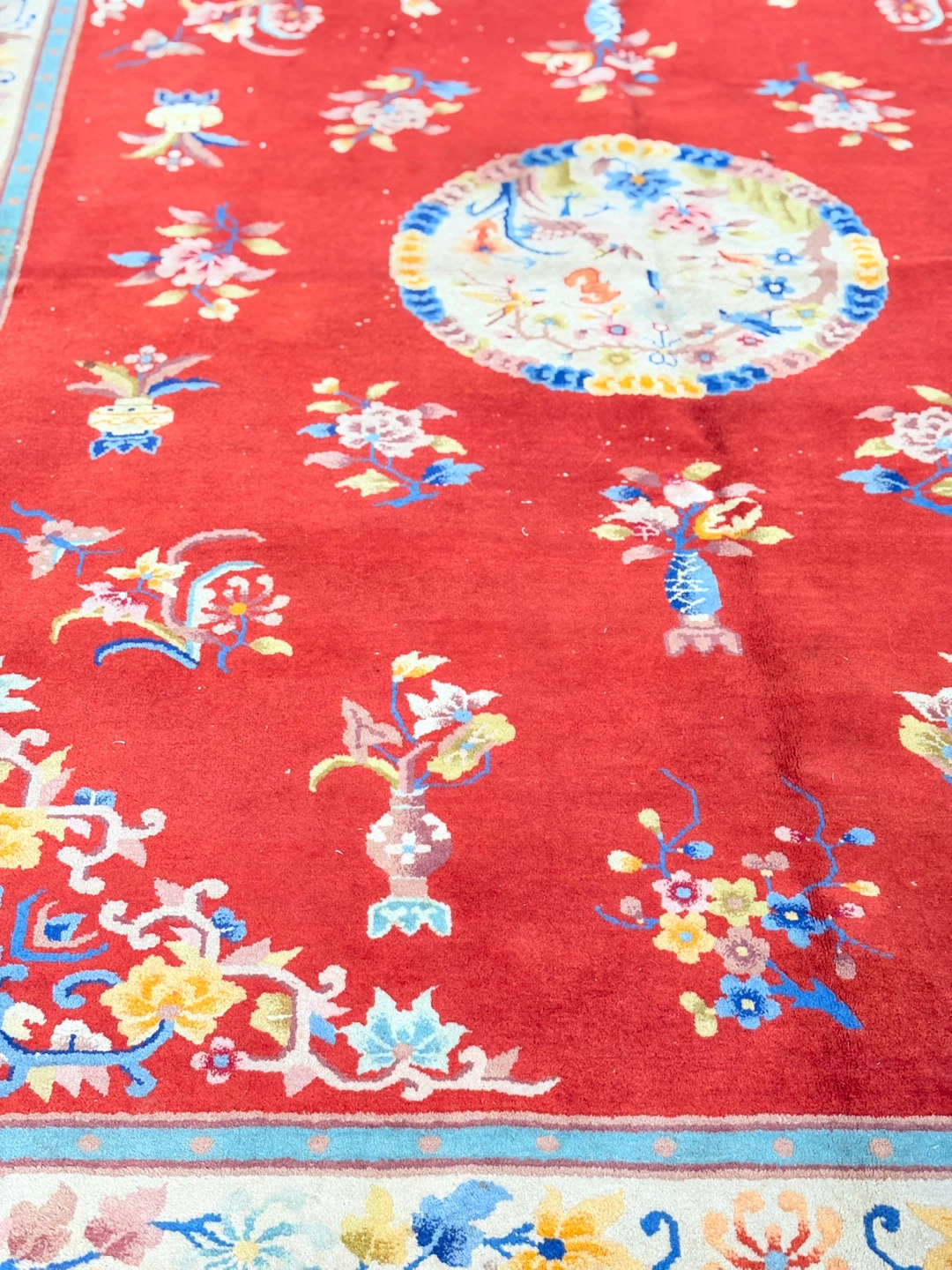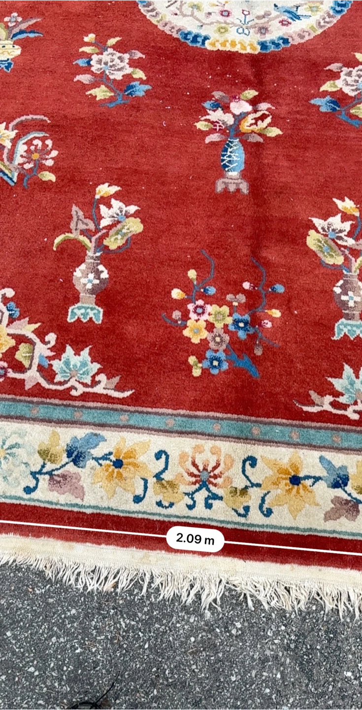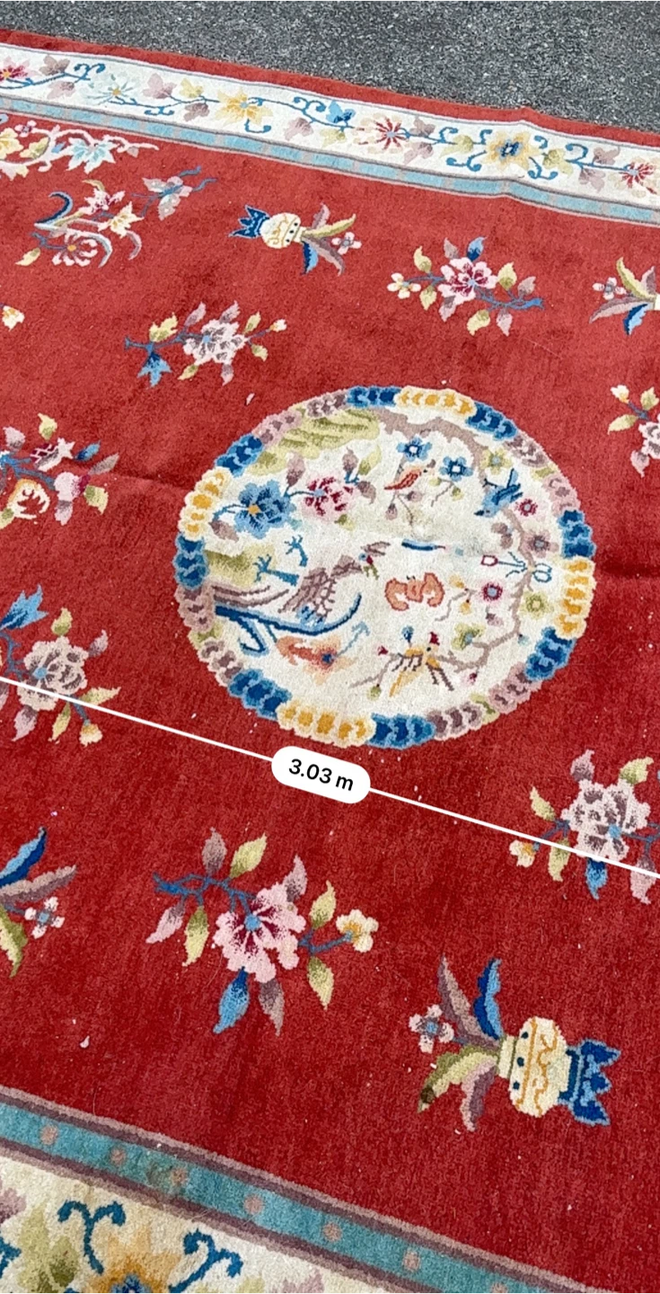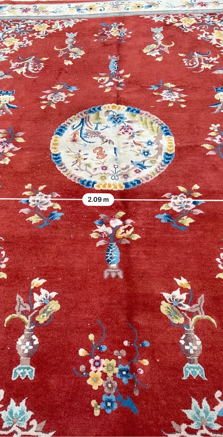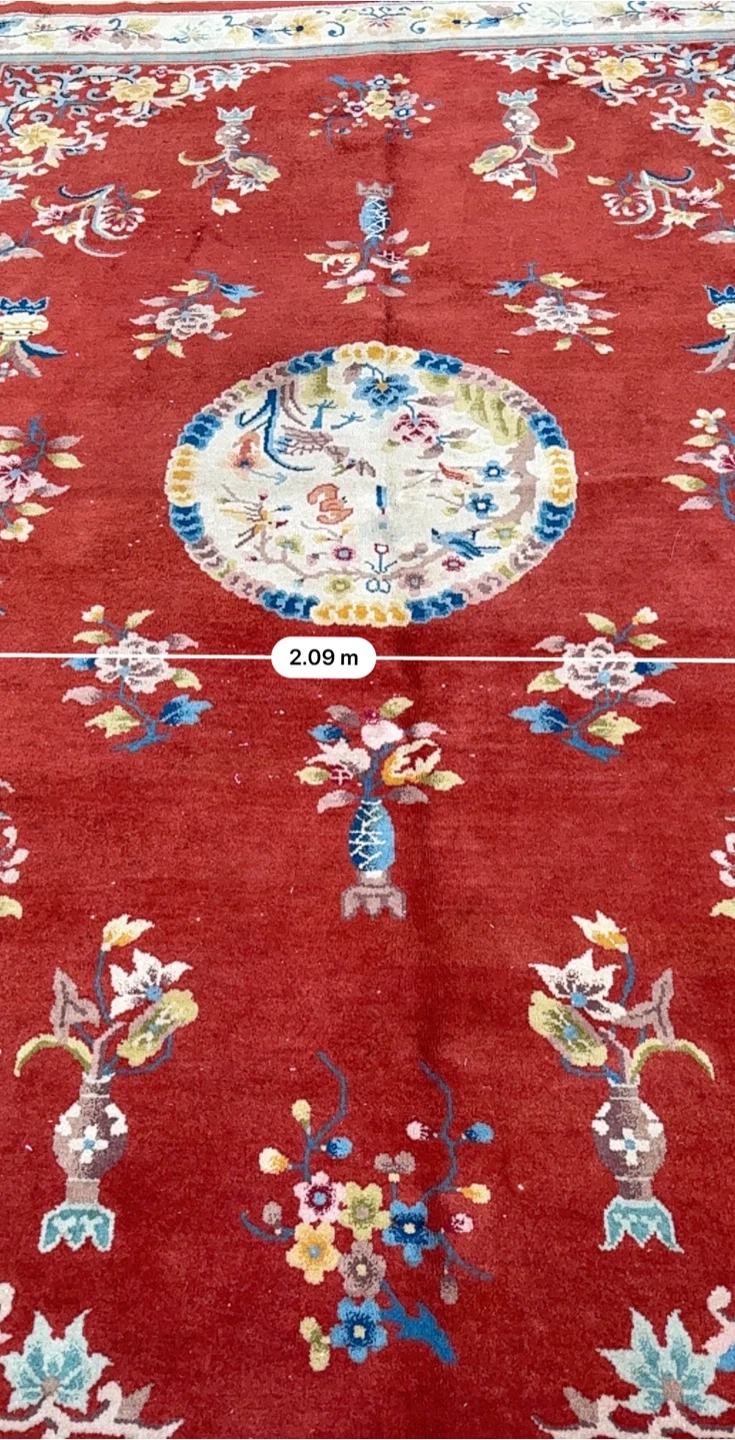 Beautiful oriental rug with a vibrant red background and intricate floral patterns! It measures approximately 2.09 meters by 3.03 meters. The rug has a unique design with floral motifs and a central medallion. Perfect for adding a touch of elegance to any room!