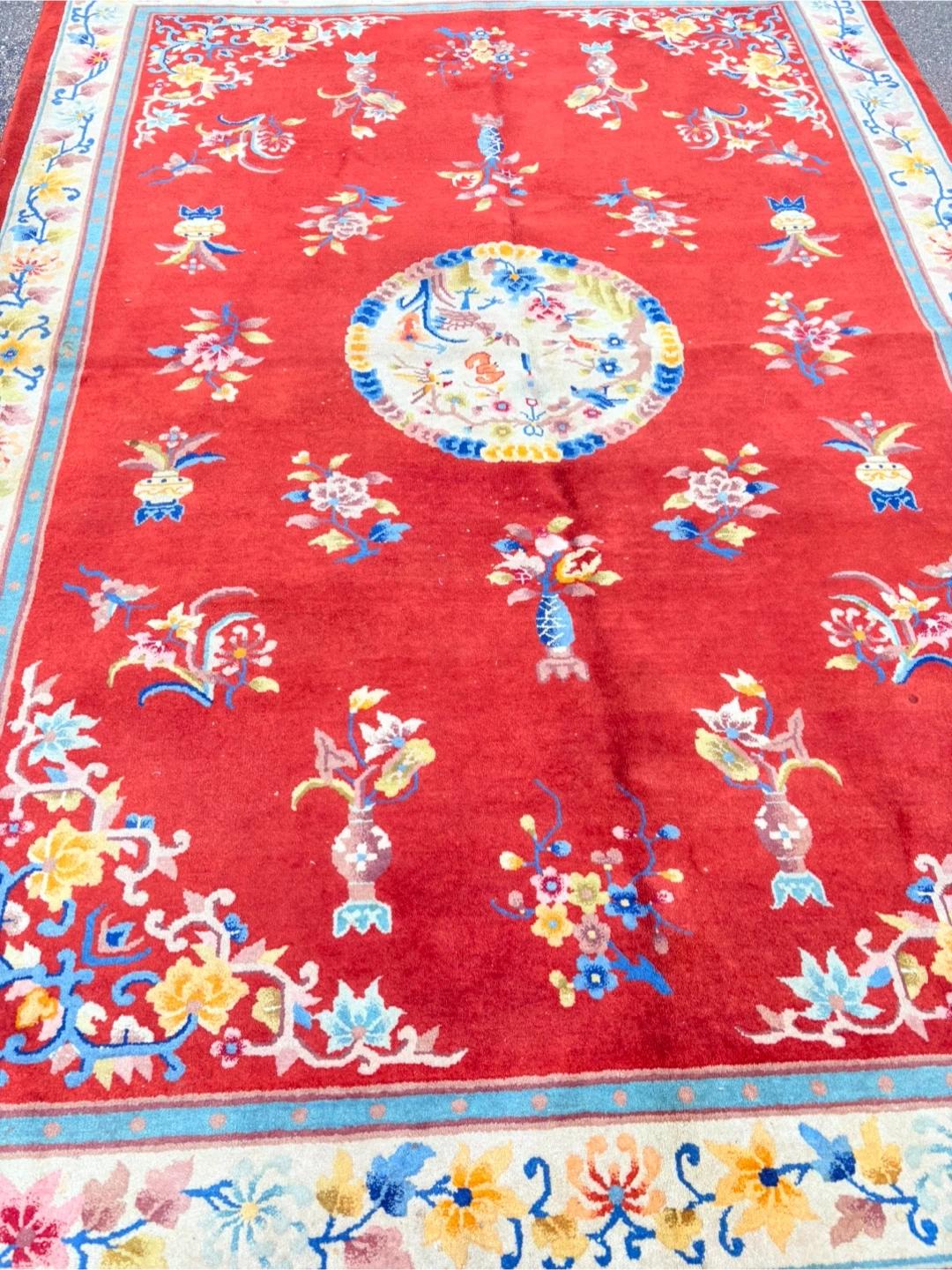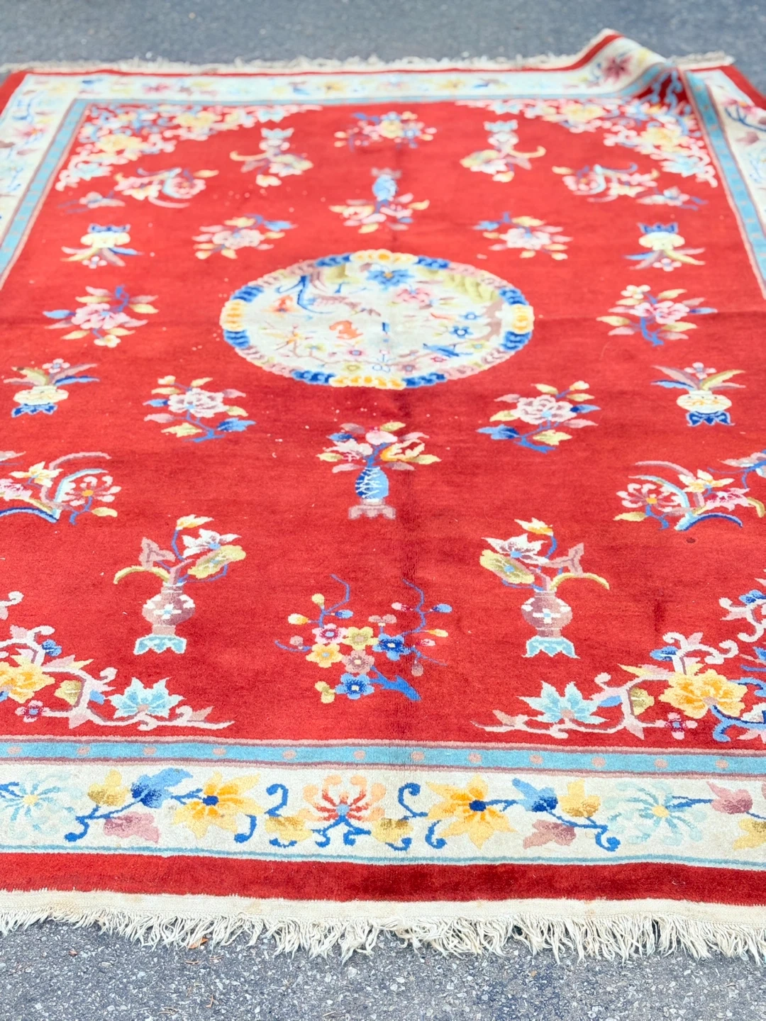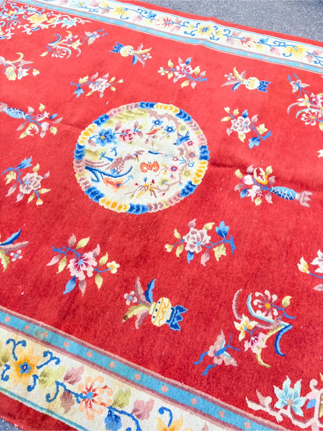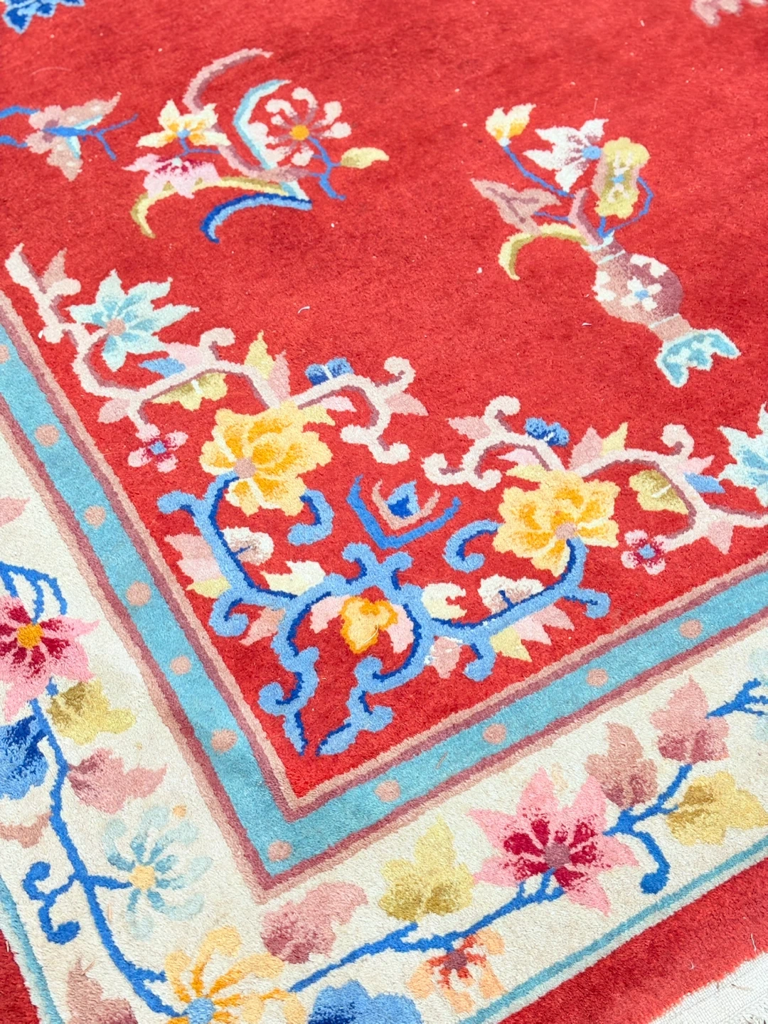 Beautiful oriental rug with a vibrant red background and intricate floral patterns! It measures approximately 2.09 meters by 3.03 meters. The rug has a unique design with floral motifs and a central medallion. Perfect for adding a touch of elegance to any room!