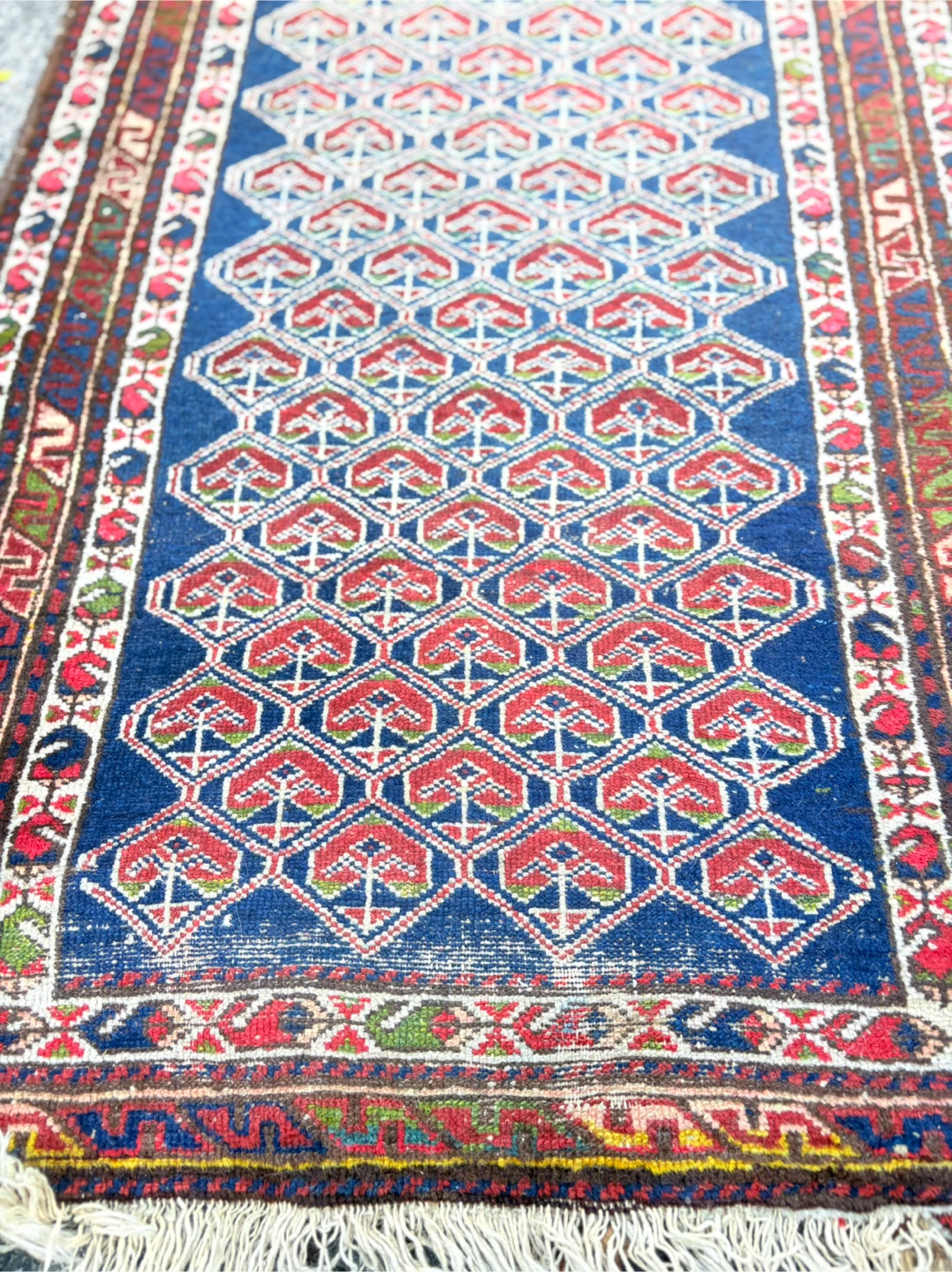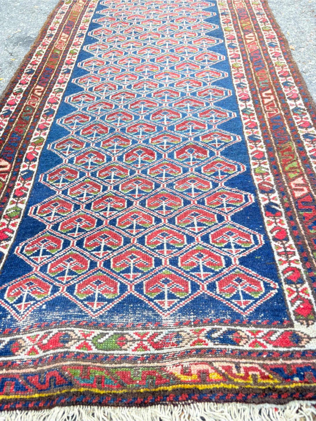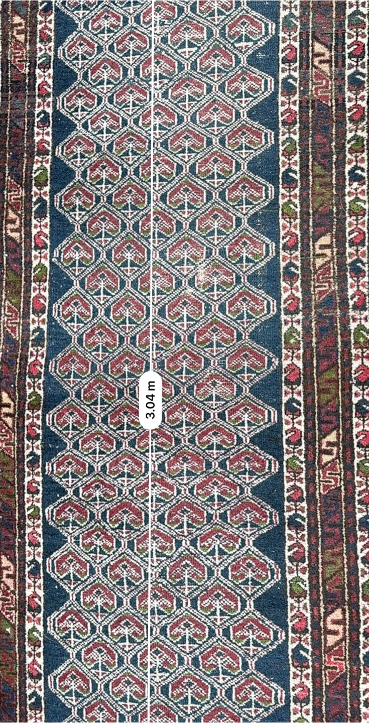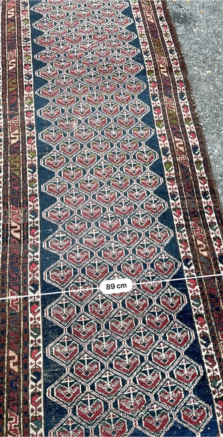 Selling a vintage oriental runner rug in good condition. It measures approximately 89cm wide and 3.04m long. The rug features a beautiful geometric pattern in blue, red, and other colours. Perfect for adding a touch of elegance to any hallway or living space!