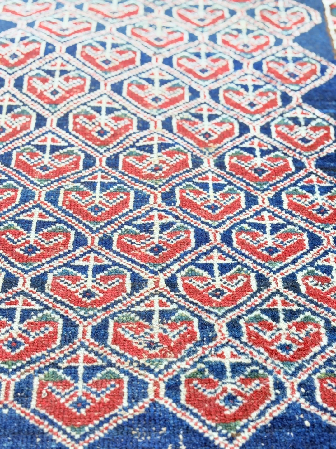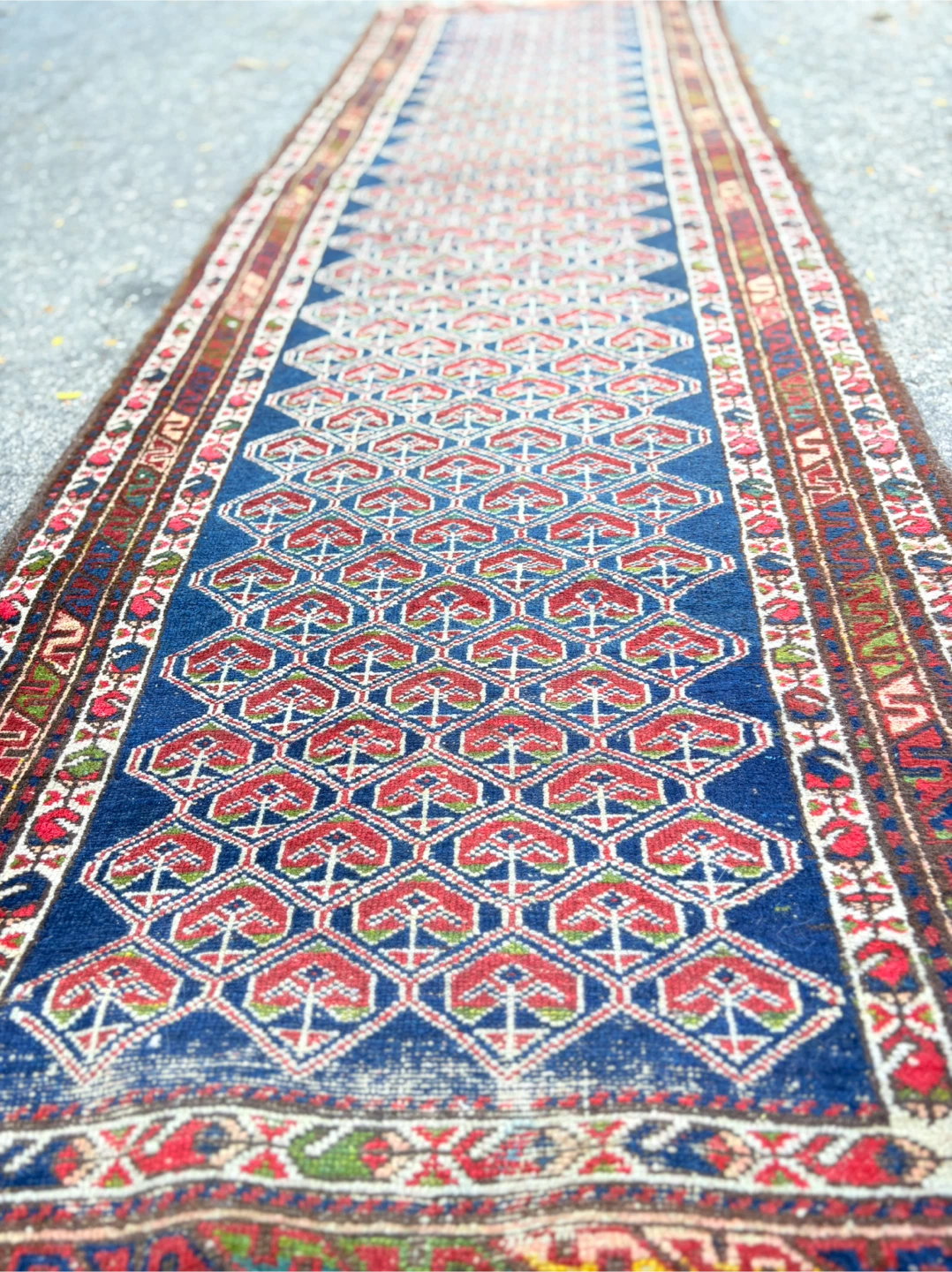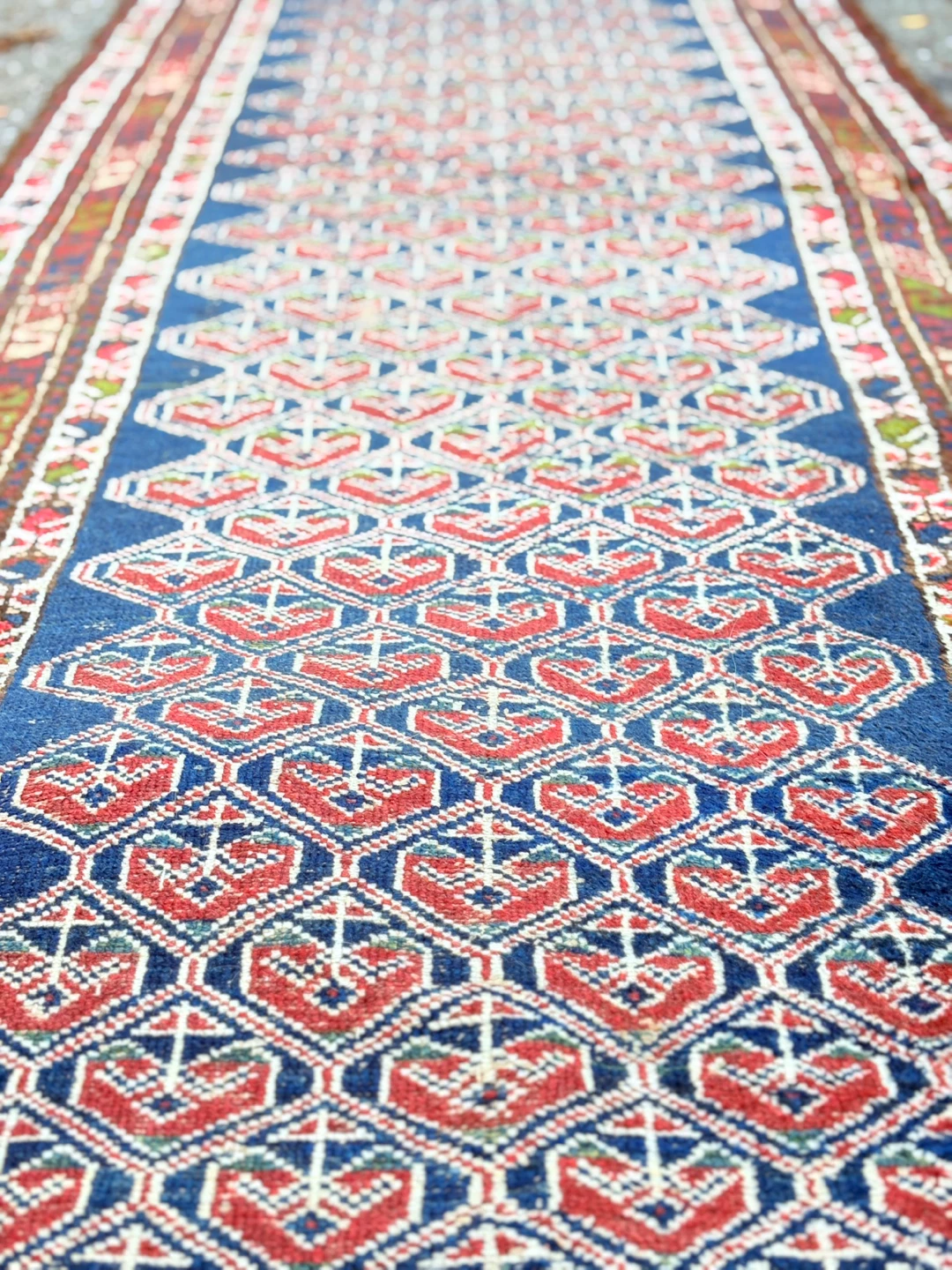 Selling a vintage oriental runner rug in good condition. It measures approximately 89cm wide and 3.04m long. The rug features a beautiful geometric pattern in blue, red, and other colours. Perfect for adding a touch of elegance to any hallway or living space!